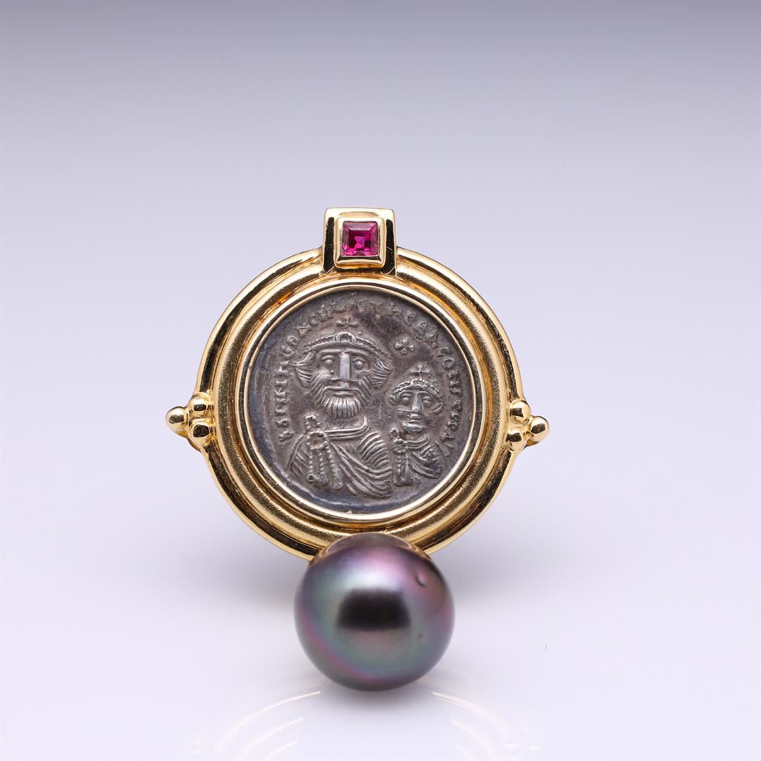 Pair of 18k yellow gold earrings; each set with silver Byzantine coin, South Sea black pearl drops and accented at the top with twin bezel set square cut rubies, each with hallmarks; gross weight 30.0 g, each 2" x 1 1/4" (approx.)