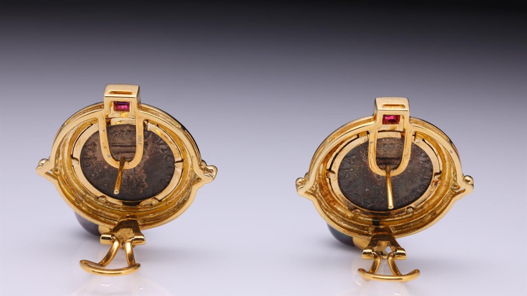 Pair of 18k yellow gold earrings; each set with silver Byzantine coin, South Sea black pearl drops and accented at the top with twin bezel set square cut rubies, each with hallmarks; gross weight 30.0 g, each 2" x 1 1/4" (approx.)