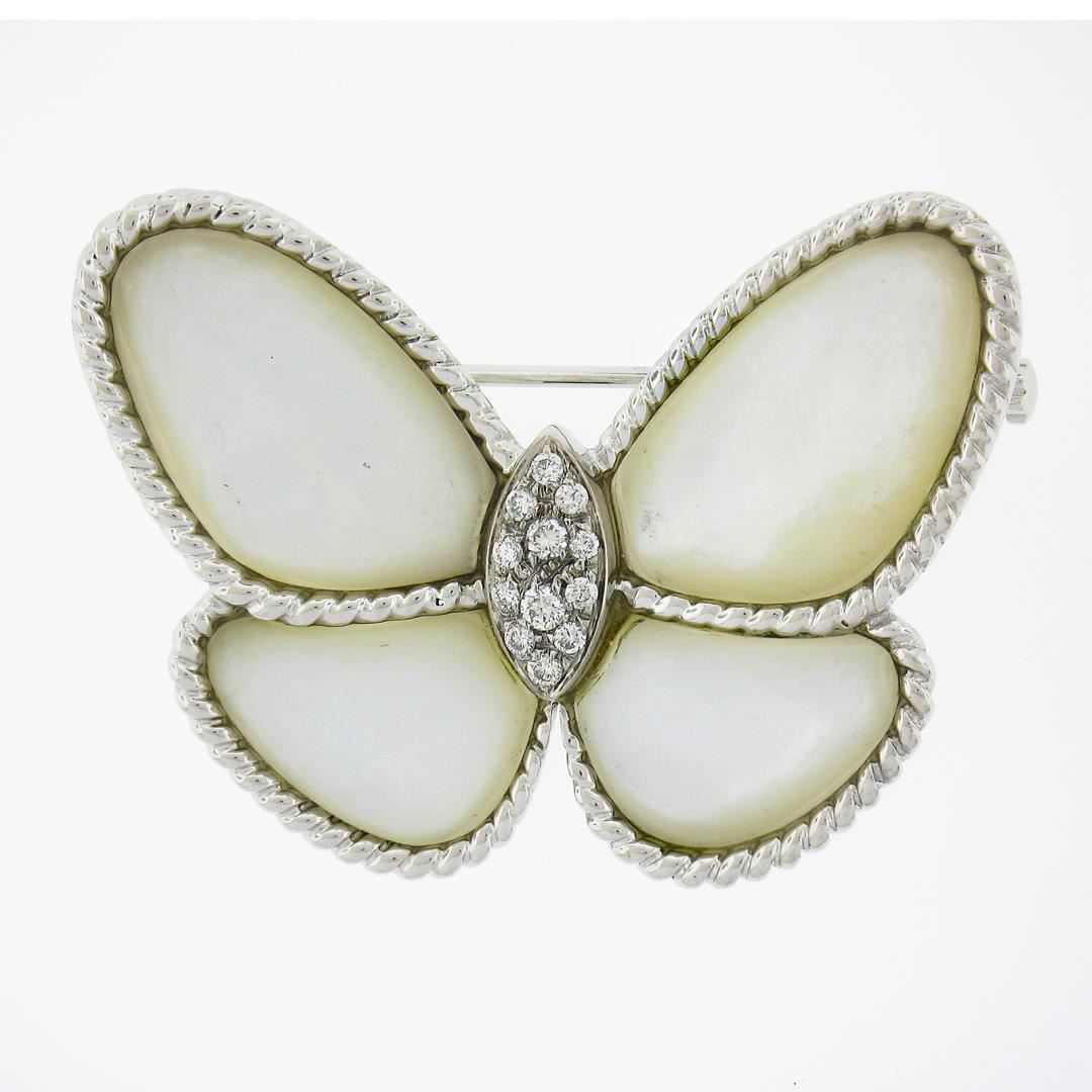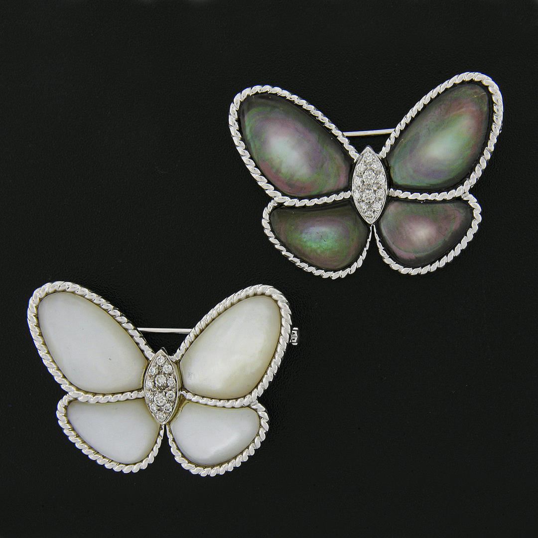 A solid 18k white gold pair of 2 butterflu broochs, featuring cutsom cut 4 black & 4 white mother of pearls , and 24 round cut natural diamonds (G/H - VS1/VS2 ; 0.30ctw). Measures 30x41.5mm and weighs a total of 32.25 grams.