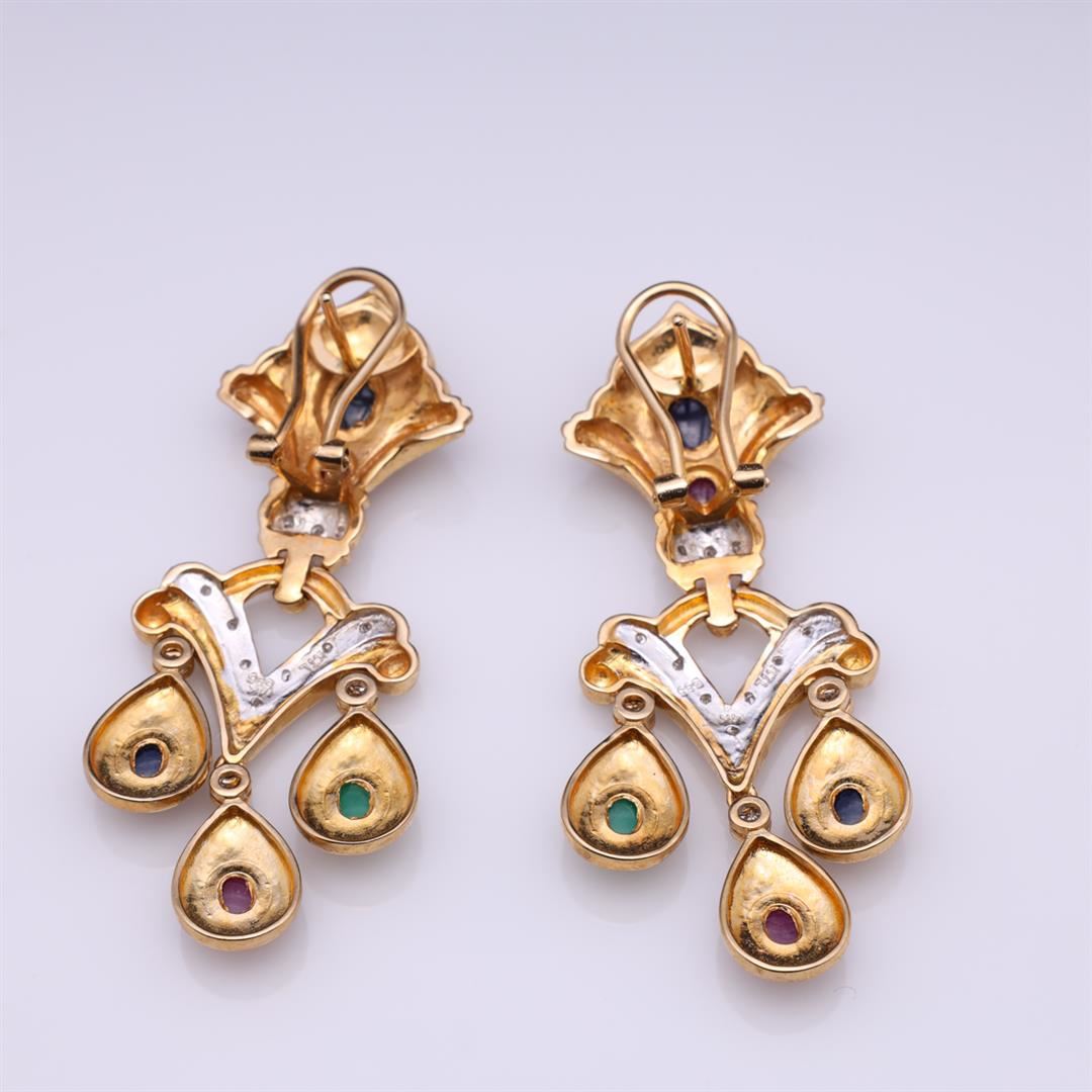 Pair of Italian 14k Gold Ruby, Emerald, Sapphire & Diamond Earrings. Total weight is 16.7 gm. Estimated retail value $5000.