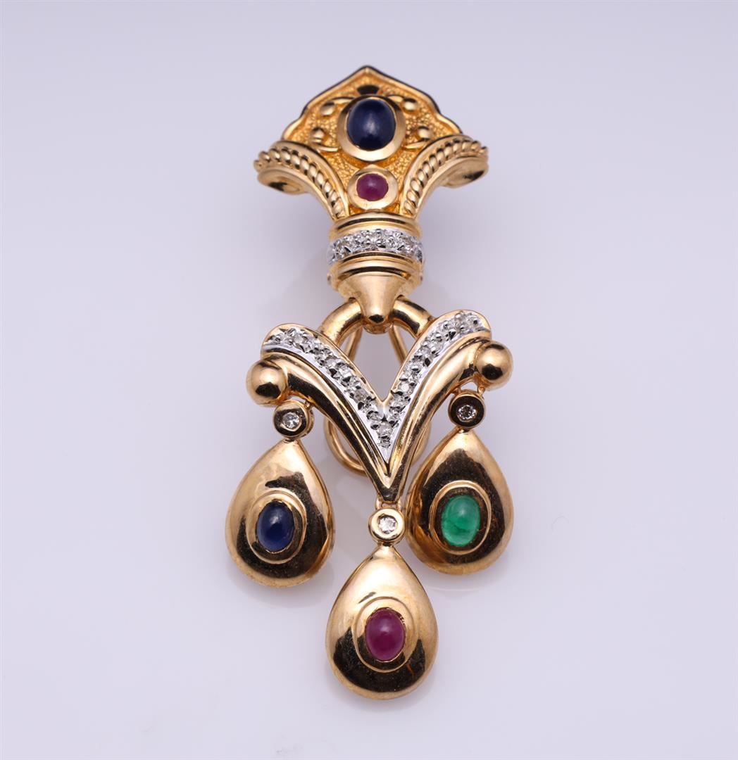 Pair of Italian 14k Gold Ruby, Emerald, Sapphire & Diamond Earrings. Total weight is 16.7 gm. Estimated retail value $5000.