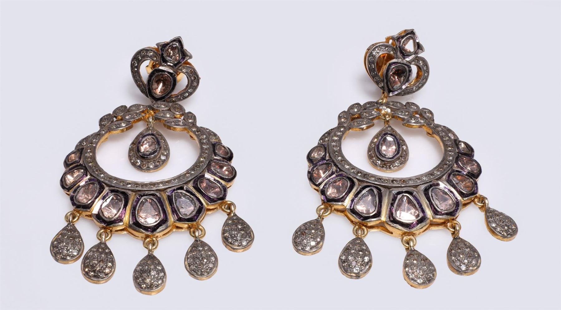 Pair of Mogul style silver topped gold earrings; each set with numerous polki diamonds; gross weight 26.3 g, each 2 1/2" x 1 3/8" (approx.)