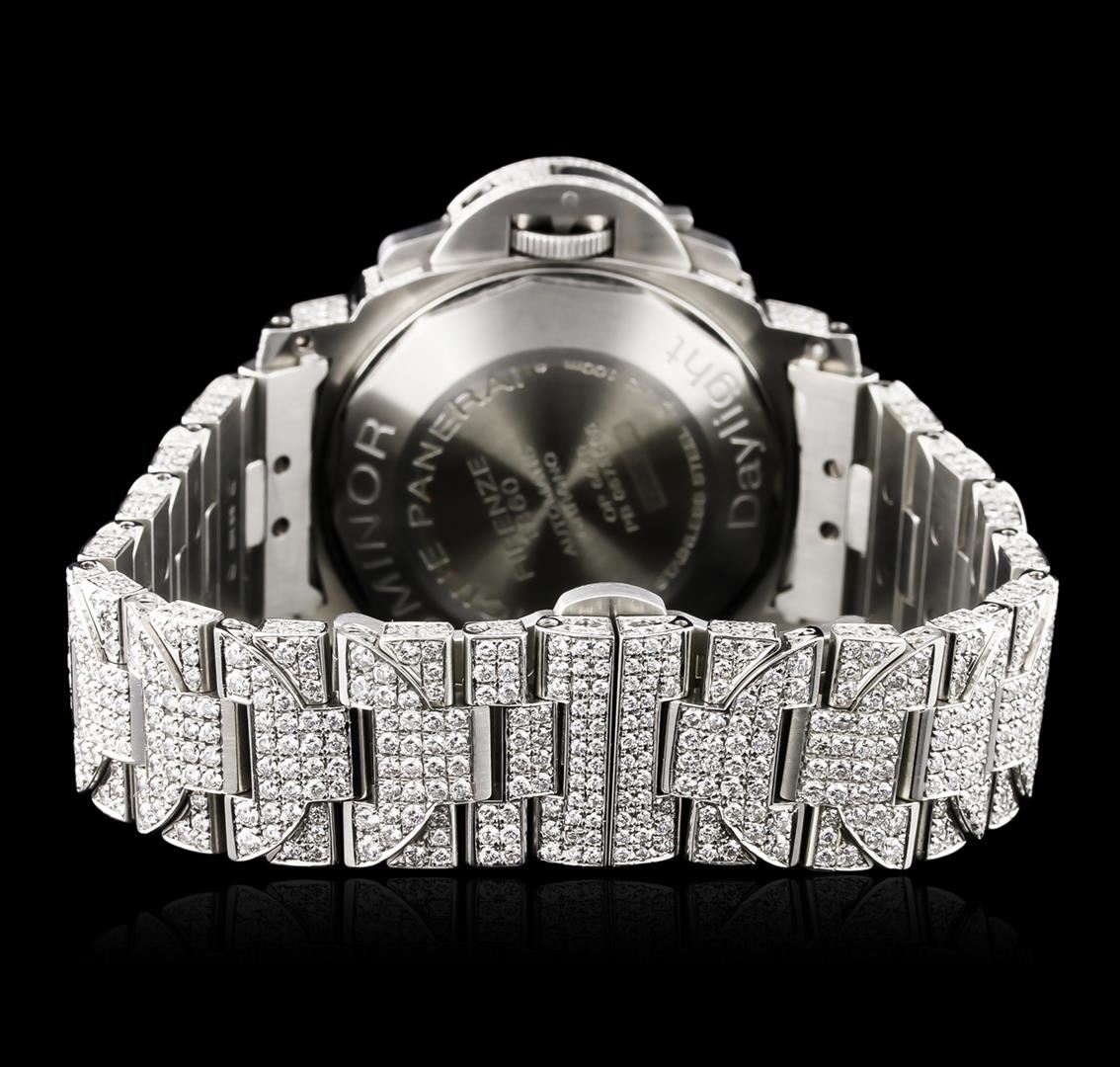 One, Panerai Luminor Chrono Daylight customized wristwatch electronically tested stainless steel, Customized diamond set Case: 44mm, Case Back: engraved with the manufacturers name, information, and ID numbers, Customized Fixed Bezel: diamond set, Customized Crown: signature crown protector, set with diamonds, Crystal: synthetic sapphire, Movement: Panerai Automatic. Dial : Black color; with luminous pointed hands and indices; Hours, Minutes and small Seconds Hands, Chronograph Functions: sub dial for Hours, Minutes, & Seconds, Date window: between t h4 o 'clock and 5 o'clock position. Customized Panerai Bracelet: set throughout with diamonds, deployment clasp with logo, Condition: G-6 Extra Fine. Nine inch length, adjustable. Containing: Approximately One Thousand Three Hundred Sixty prong set round brilliant cut diamonds, approximate total weight of Stones = 14.00ct. Set & graded throughout. Clarity VVS-2 to VS-2Color F-H. Total Wei ght of Diamonds 14.00cts.Total Weight of Watch 241.92 grams. AIG Appraised at $65,200.00.
