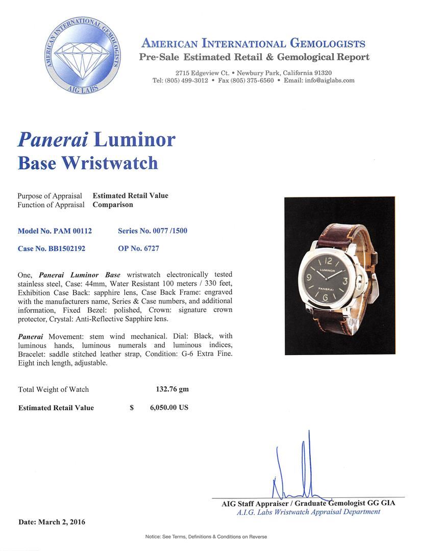 One, Panerai Luminor Base wristwatch electronically tested stainless steel, Case: 44mm, Water Resistant 100 meters / 330 feet, Exhibition Case Back: sapphire lens, Case Back Frame: engraved with the manufacturers name, Series & Case numbers, and additional information, Fixed Bezel: polished, Crown: signature crown protector, Crystal: Anti-Reflective Sapphire lens. Panerai Movement: stem wind mechanical. Dial: Black, with luminous hands, luminous numerals and luminous indices, Bracelet: saddle stitched leather strap, Condition: G-6 Extra Fine. Eight inch length, adjustable. Total Weight of Watch132.76gm. AIG Appraised at $6,050.00.