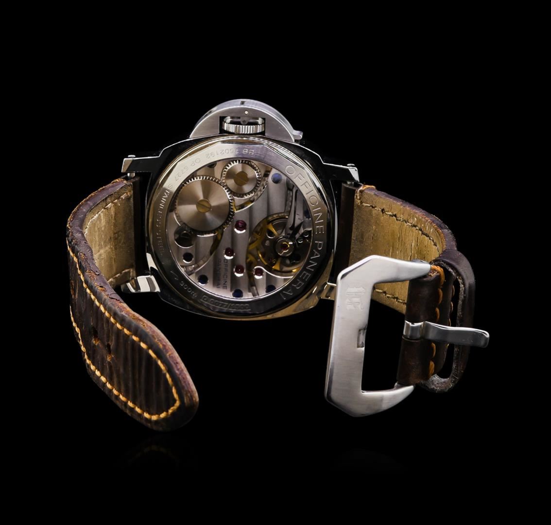 One, Panerai Luminor Base wristwatch electronically tested stainless steel, Case: 44mm, Water Resistant 100 meters / 330 feet, Exhibition Case Back: sapphire lens, Case Back Frame: engraved with the manufacturers name, Series & Case numbers, and additional information, Fixed Bezel: polished, Crown: signature crown protector, Crystal: Anti-Reflective Sapphire lens. Panerai Movement: stem wind mechanical. Dial: Black, with luminous hands, luminous numerals and luminous indices, Bracelet: saddle stitched leather strap, Condition: G-6 Extra Fine. Eight inch length, adjustable. Total Weight of Watch132.76gm. AIG Appraised at $6,050.00.
