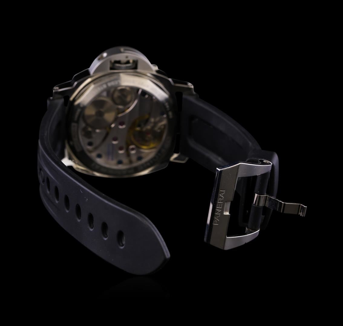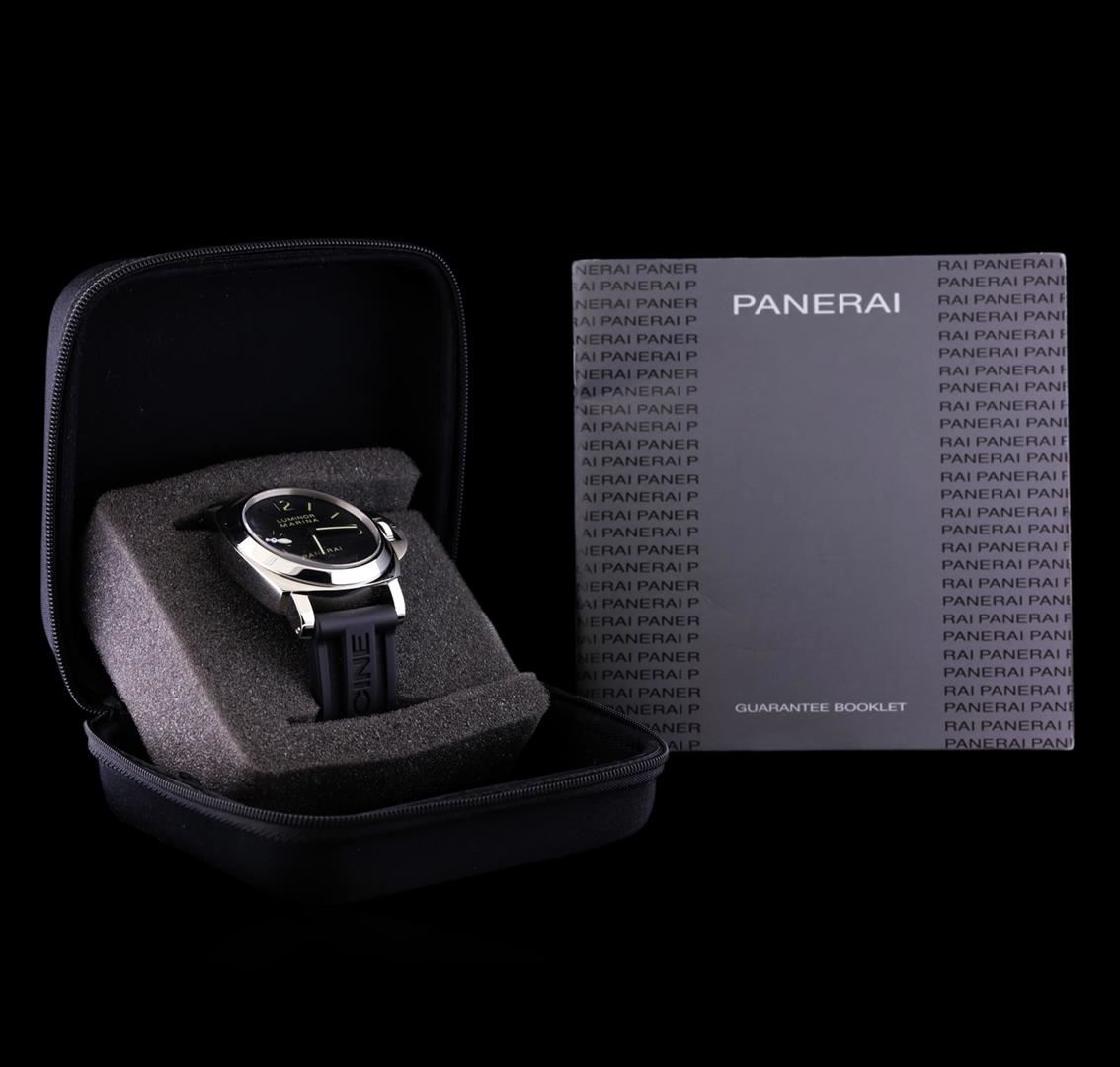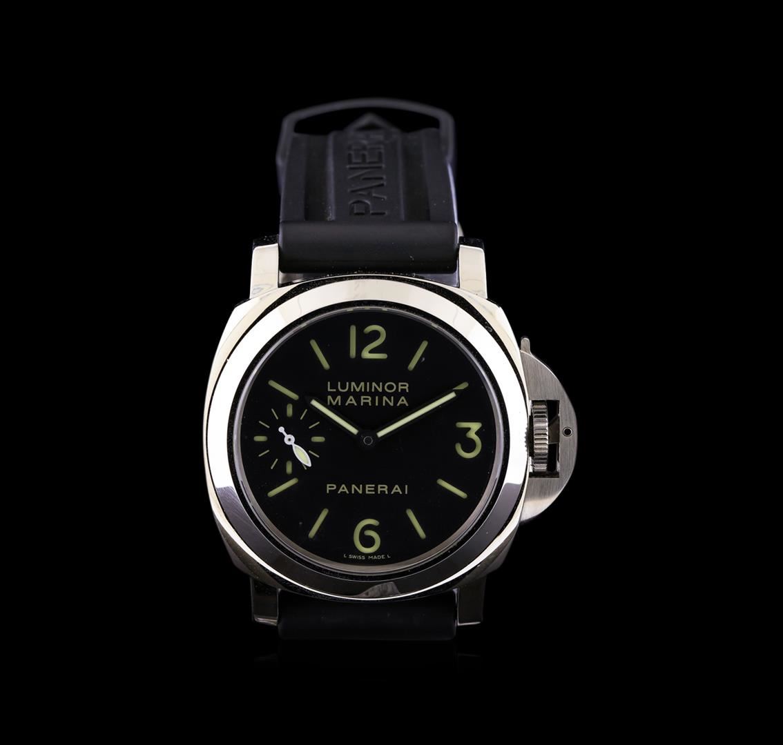 One, Panerai Luminor Marina wristwatch electronically tested stainless steel, Case: 44mm, Water Resistant: 300 meters / 1000 feet, Exhibition Case Back: synthetic sapphire, the frame of the case back is engraved with the manufacturer's name, ID numbers and information. Fixed Bezel: polished, Panerai signature Crown: snap locking crown protector, Crystal: Anti-reflective synthetic Sapphire, Panerai Movement: mechanical. Panerai signed Dial: Black, with luminous hands, luminous numerals, and luminous indices, Sub Dial: seconds sub dial at the 9 o'clock position, Panerai Bracelet: rubber strap, Panerai stainless steel buckle with logo, Condition: G-6 Extra Fine. Nine inch length, adjustable. Total Weight of Watch 146.68gm. AIG Appraised at $6,150.00.