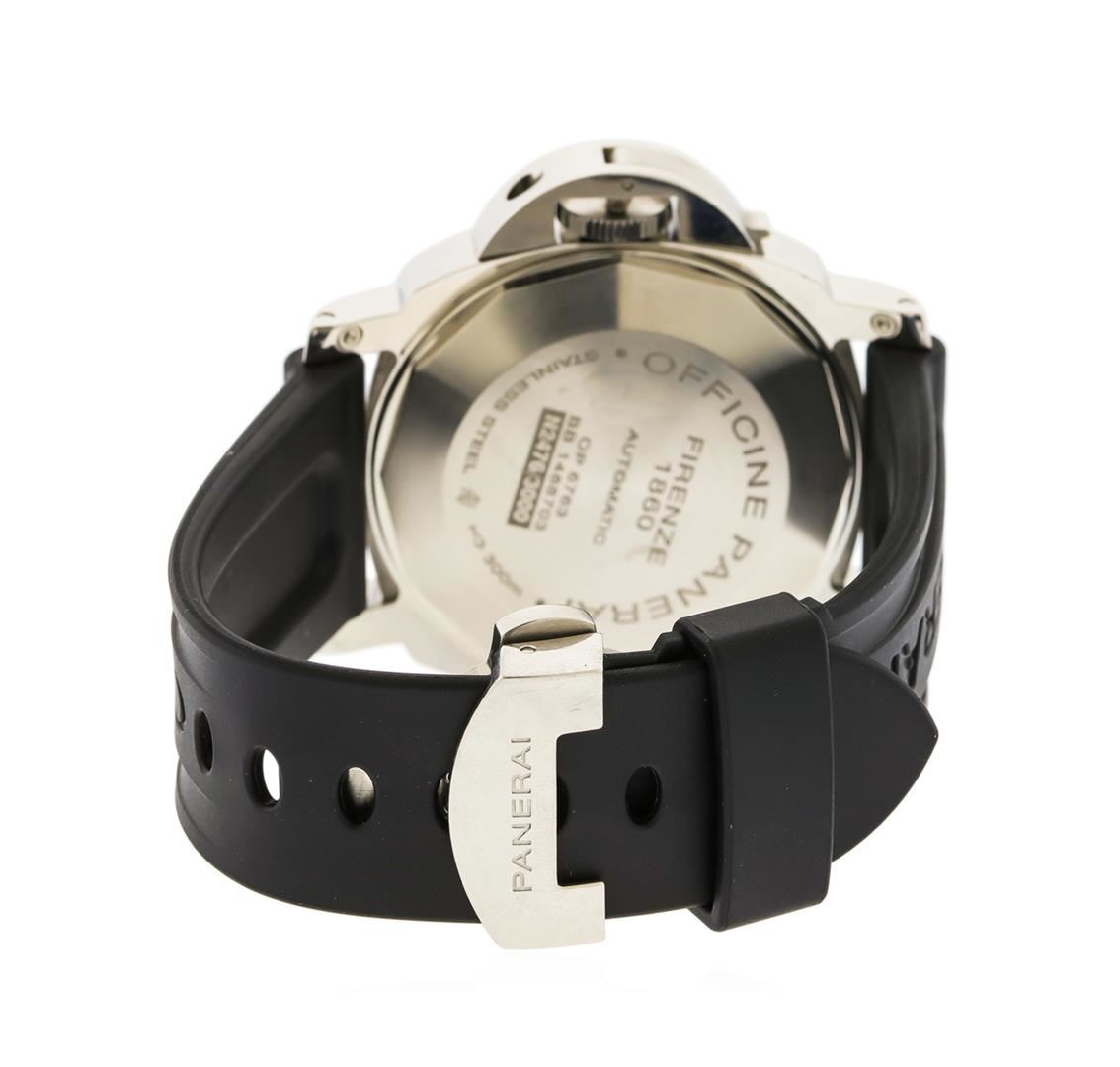 One, Panerai Luminor Marina wristwatch electronically tested stainless steel, Case: 44mm, water resistant to 300 meters/ 1000 feet, Case Back: engraved with the manufacturers name and information, Fixed Bezel: polished, Crown: signature crown protector, Crystal: Anti-reflective Sapphire. Movement: Panerai Automatic, Power Reserve: 42 hours. Dial: Black, with luminous hands and luminous indices, Numeral & Indices Hour Markers, Seconds Subdial: 9 0'clock position, Date Window: 3 o'clock position, Panerai Bracelet: rubber strap with stainless steel Panerai buckle, Condition: G-6 Extra Fine. Eight inch length, adjustable. Total Weight of Watch159.65gm. AIG Appraised at $6,200.00.