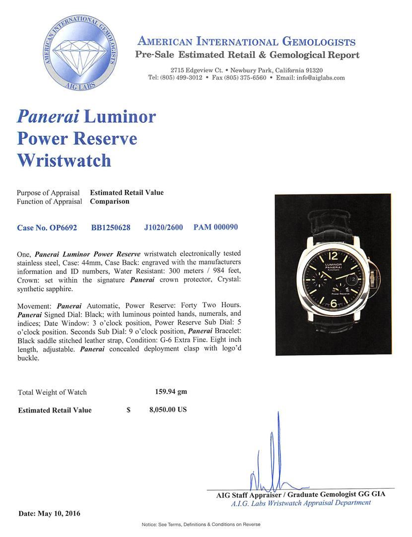 One, Panerai Luminor Power Reserve wristwatch electronically tested stainless steel, Case: 44mm, Case Back: engraved with the manufacturers information and ID numbers, Water Resistant: 300 meters / 984 feet, Crown: set within the signature Panerai crown protector, Crystal: synthetic sapphire. Movement: Panerai Automatic, Power Reserve: Forty Two Hours. Panerai Signed Dial: Black; with luminous pointed hands, numerals, and indices; Date Window: 3 o'clock position, Power Reserve Sub Dial: 5 o'clock position. Seconds Sub Dial: 9 o'clock position, Panerai Bracelet: Black saddle stitched leather strap, Condition: G-6 Extra Fine. Eight inch length, adjustable. Panerai concealed deployment clasp with logo'd buckle. Total Weight of Watch 159.94gm. AIG Appraised at $8,050.00.