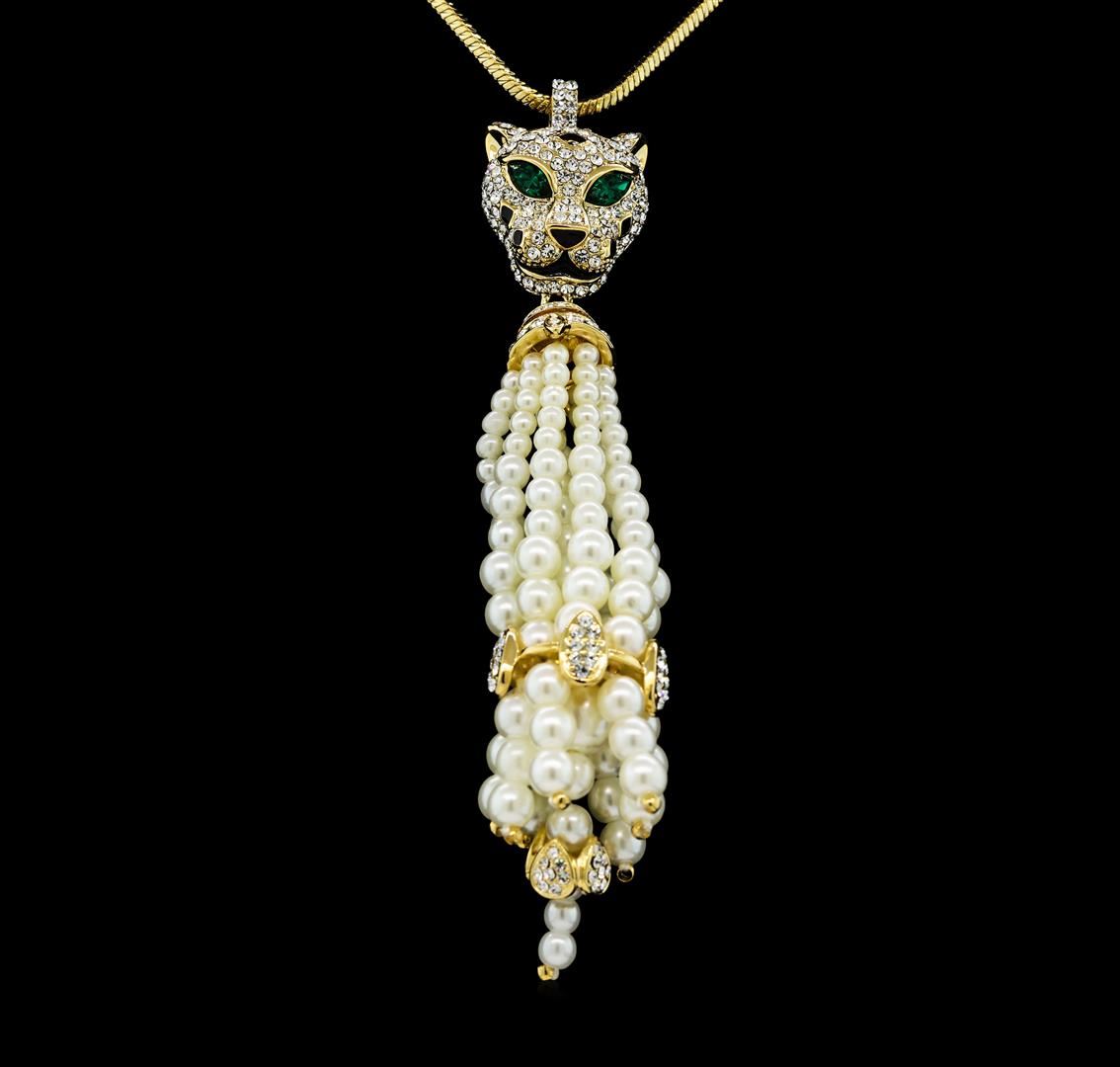 High end designer jewelry. Panther Pearl Tassel Necklace - Gold Plated. Gold Plated Chain/1.5" Ext Clasp. Gold/ White. 20/3inches.