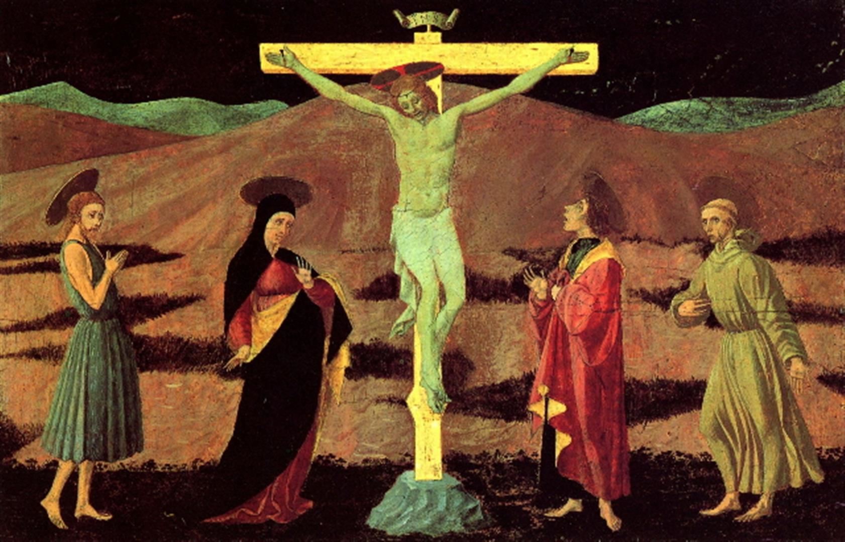 Artist: Paolo Uccello - Title: Christ at the Cross - Medium: Fine Art Giclee on Canvas - Image Size: Approximately 32 inches x 20.5 inches - Unframed on Unstretched Canvas - Biography: Paolo Uccello (c. 1397 - 10 December 1475), born Paolo di Dono, was a Florentine painter and mathematician who was notable for his pioneering work on visual perspective in art. In his book Lives of the Most Excellent Painters, Sculptors, and Architects, Giorgio Vasari wrote that Uccello was obsessed by his interest in perspective and would stay up all night in his study trying to grasp the exact vanishing point. While his contemporaries used perspective to narrate different or succeeding stories, Uccello used perspective to create a feeling of depth in his paintings. Paolo worked in the Late Gothic tradition, emphasizing colour and pageantry rather than the classical realism that other artists were pioneering. His style is best described as idiosyncratic, and he left no school of followers.