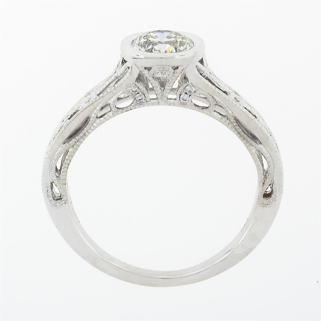 An estate soldi 18k white gold open work engagement ring by Parade, featuring 1 round brilliant cut natural dimaond (G - VS1 ; 0.65ct), accented with 18 round brilliant cut natural diamonds (G/H - VS1/VS2 ; 0.22ctw). The ring is size 5.0, weighs a total of 2.98 grams, and measures 7.05mm wide.