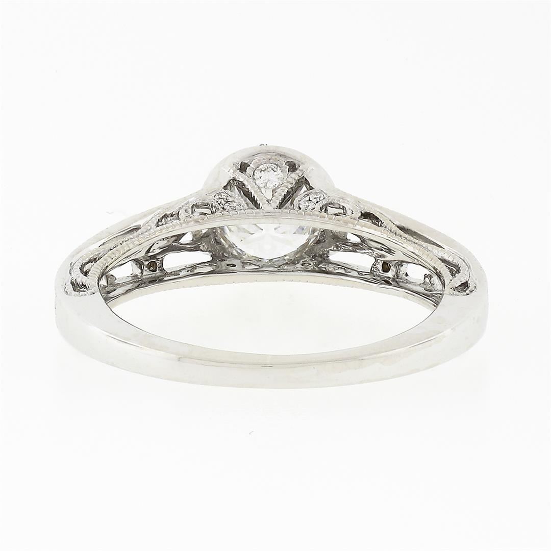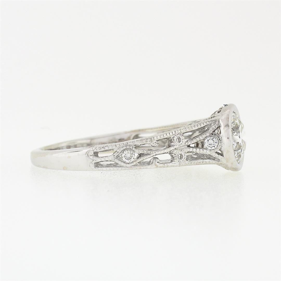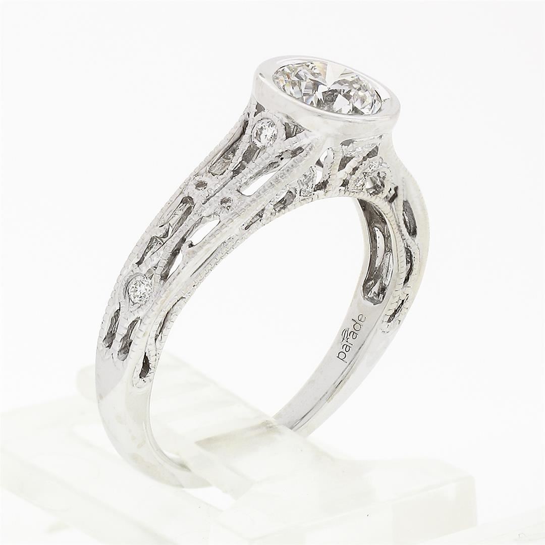 An estate soldi 18k white gold open work engagement ring by Parade, featuring 1 round brilliant cut natural dimaond (G - VS1 ; 0.65ct), accented with 18 round brilliant cut natural diamonds (G/H - VS1/VS2 ; 0.22ctw). The ring is size 5.0, weighs a total of 2.98 grams, and measures 7.05mm wide.