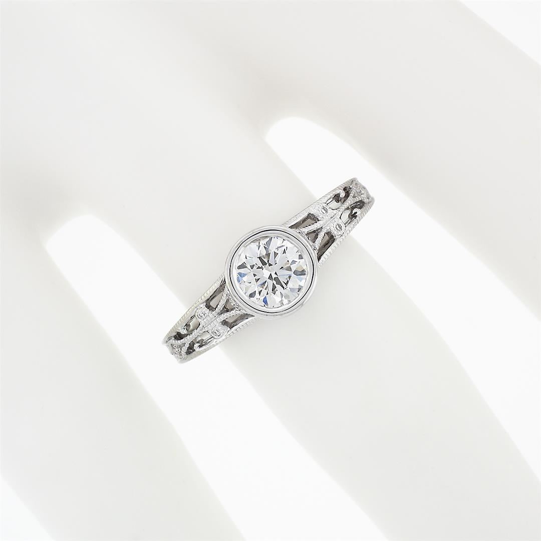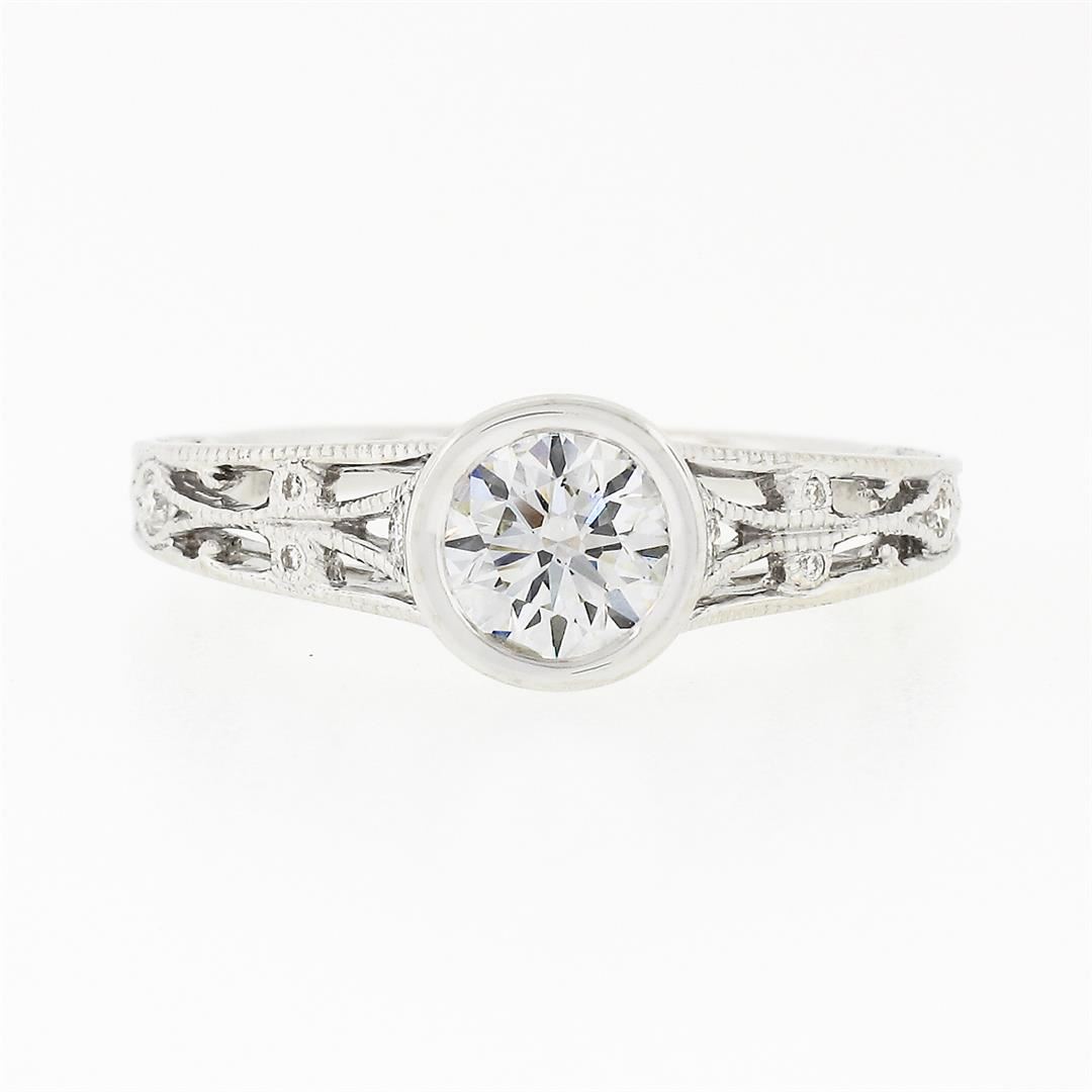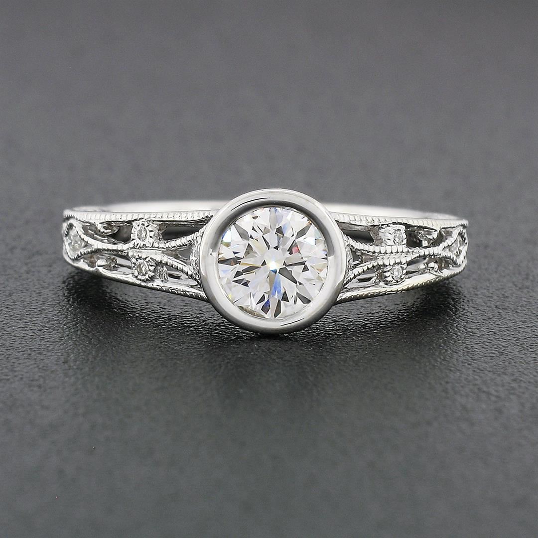 An estate soldi 18k white gold open work engagement ring by Parade, featuring 1 round brilliant cut natural dimaond (G - VS1 ; 0.65ct), accented with 18 round brilliant cut natural diamonds (G/H - VS1/VS2 ; 0.22ctw). The ring is size 5.0, weighs a total of 2.98 grams, and measures 7.05mm wide.