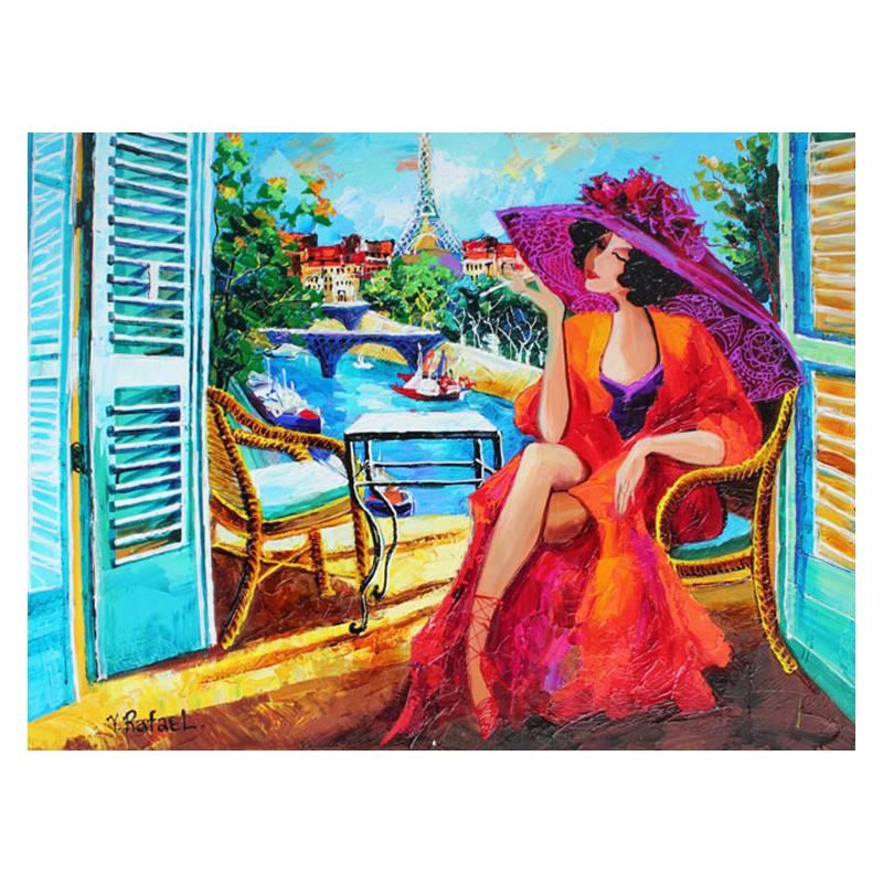 "Parisian Afternoon" is an original painting, acrylic on stretched canvas, by Yana Rafael. Hand signed by the artist, this piece is accompanied by certificate of authenticity and measures approximately 30" x 40".