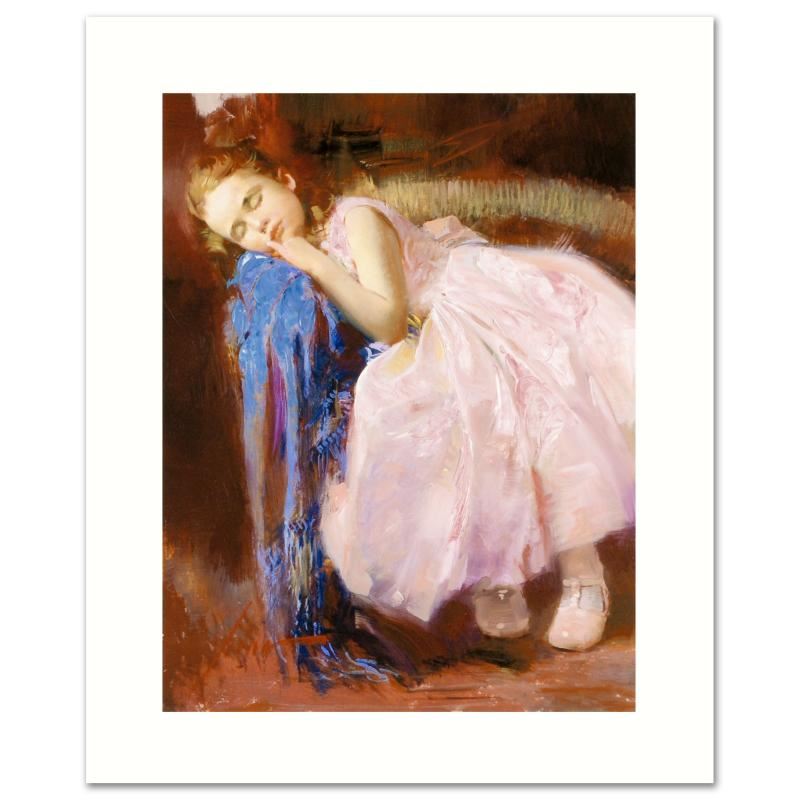 Pino's portraits allow glimpses into intensely personal, intimate spaces, conveying emotion through rich, warm color and sensual brushwork. "Party Dreams" is a limited edition giclee on canvas that has been hand-embellished by Pino himself, AP numbered and hand signed by Pino (1939-2010). Includes Certificate of Authenticity! Measures approx. 16" x 12" (image).