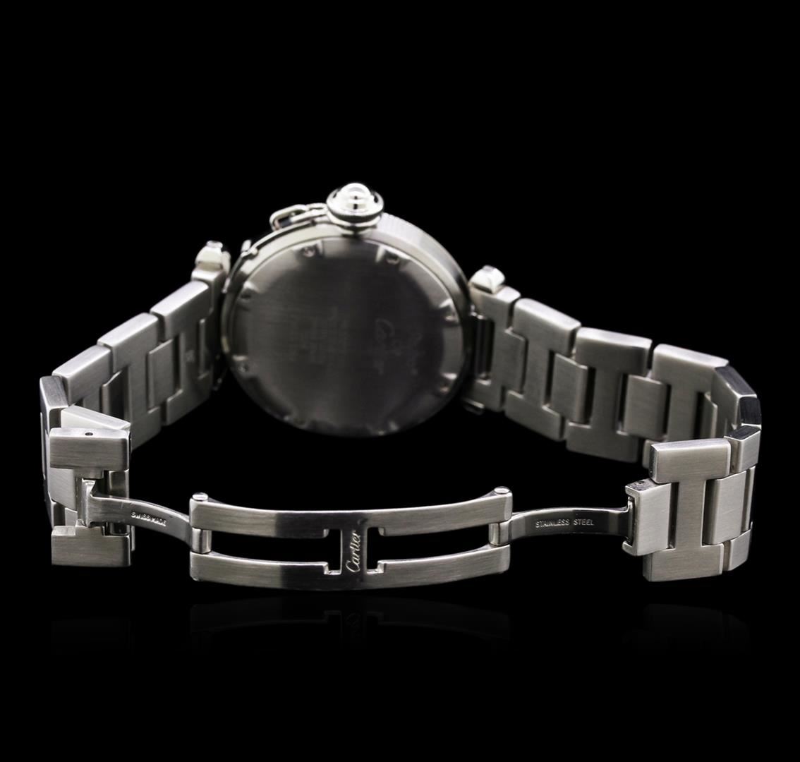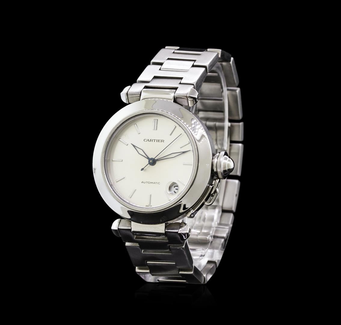One Pasha de Cartier wristwatch featuring: Movement: Automatic. Case: Stainless steel. Dial: Silver. Date window located between the 4 and 5 o'clock position. Bracelet: Stainless steel. Water resistant to 100m.