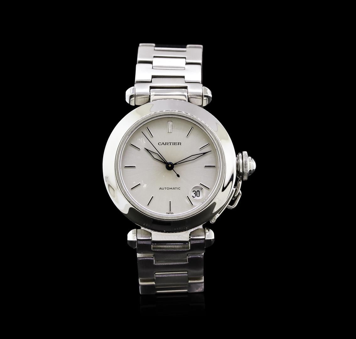 One Pasha de Cartier wristwatch featuring: Movement: Automatic. Case: Stainless steel. Dial: Silver. Date window located between the 4 and 5 o'clock position. Bracelet: Stainless steel. Water resistant to 100m.