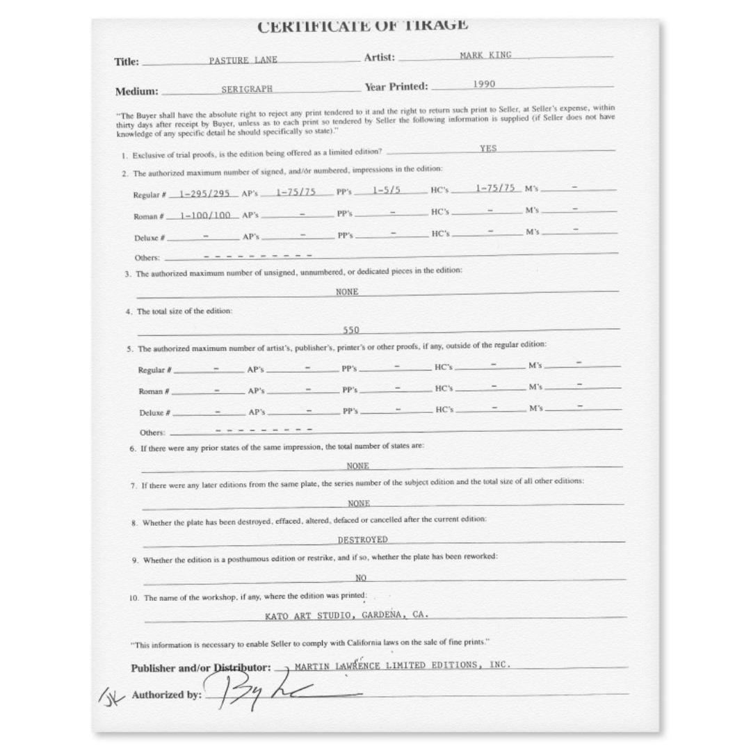 "Pasture Lane" is a limited edition serigraph on paper by Mark King (1931-2014). Hand signed and numbered this piece comes with a letter of authenticity and measures approximately 30" x 40" (image).