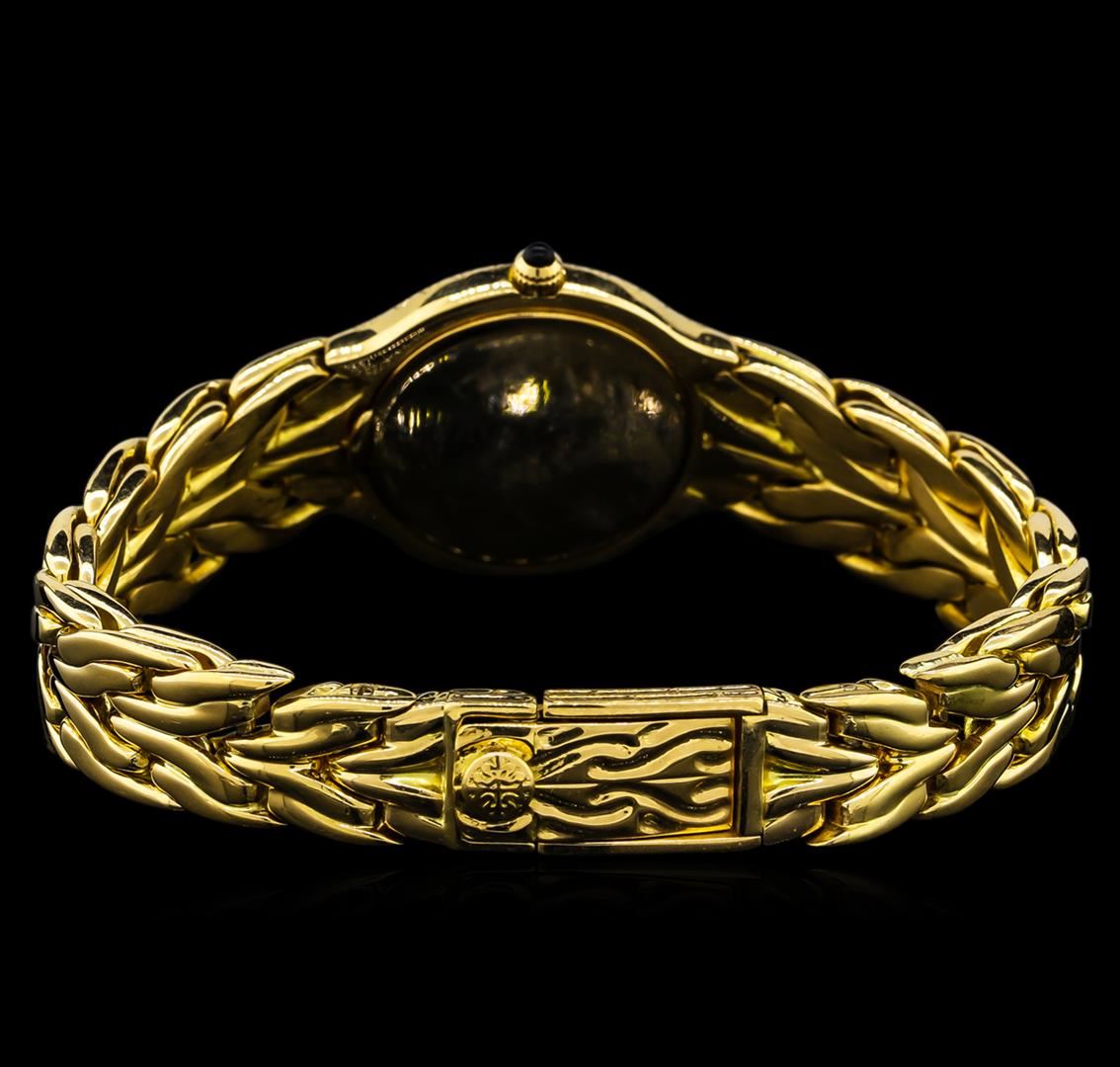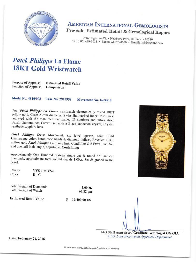 One, Patek Philippe La Flame wristwatch electronically tested 18KT yellow gold, Case: 23mm diameter, Swiss Hallmarked Inner Case Back: engraved with the manufacturers name, ID numbers and information, Bezel: diamond set, Crown: set with a Black cabochon crystal, Crystal: synthetic sapphire lens. Patek Philippe Swiss Movement: six jewel quartz, Dial: Light Champagne color, baton rope hands & diamond indices, Bracelet: 18KT yellow gold Patek Philippe La Flame link, Condition: G-6 Extra Fine. Six and one half inch length, adjustable. Containing: Approximately One Hundred Sixteen single cut & round brilliant cut diamonds, approximate total weight equals 1.00ct. Set & graded in the bezel. Clarity VVS-1 to VS-1. Color: E - G. Total Weight of Diamonds 1.00ct. Total Weight of Watch 63.82gm. AIG Appraised at $19,400.00.