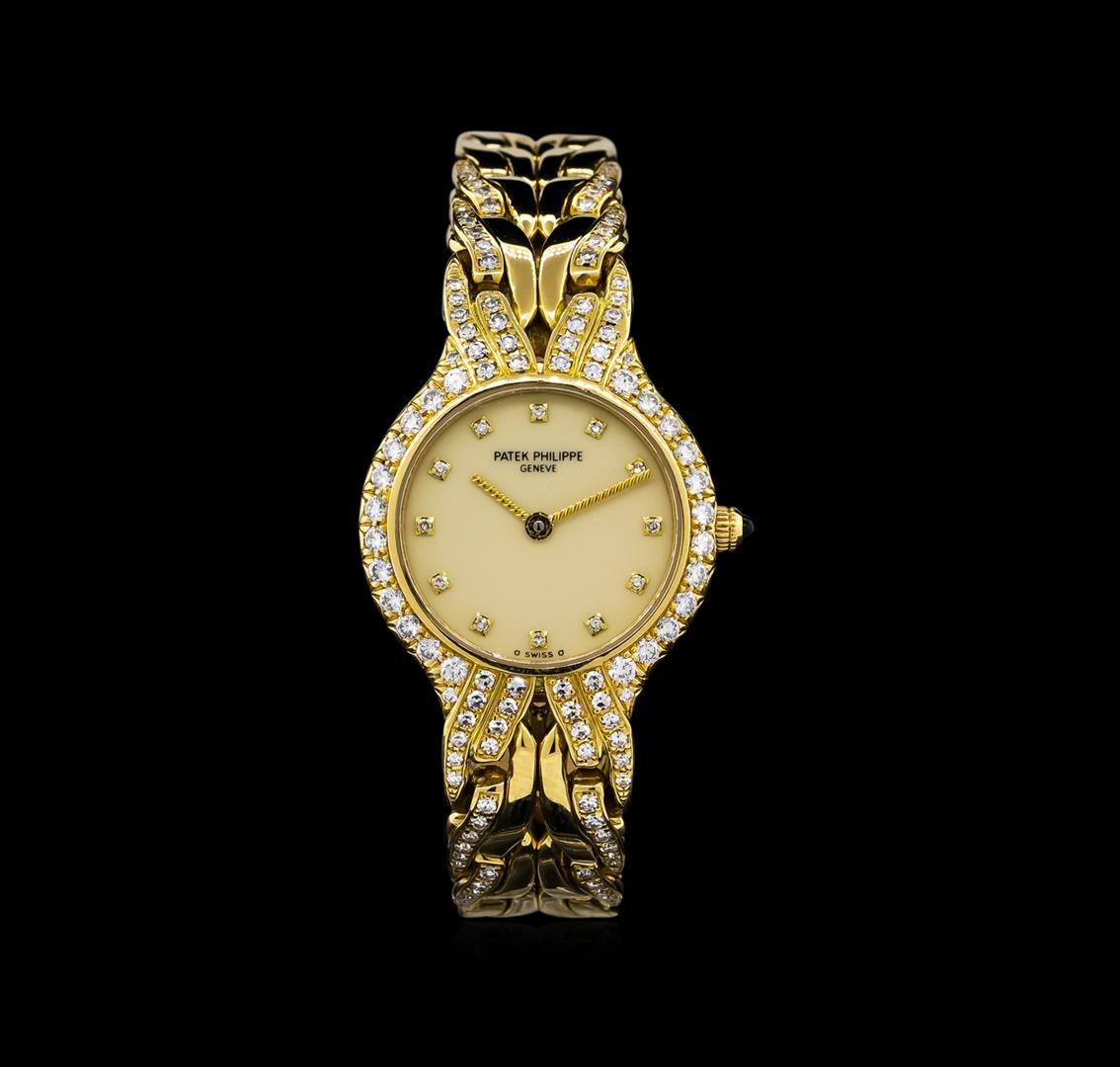 One, Patek Philippe La Flame wristwatch electronically tested 18KT yellow gold, Case: 23mm diameter, Swiss Hallmarked Inner Case Back: engraved with the manufacturers name, ID numbers and information, Bezel: diamond set, Crown: set with a Black cabochon crystal, Crystal: synthetic sapphire lens. Patek Philippe Swiss Movement: six jewel quartz, Dial: Light Champagne color, baton rope hands & diamond indices, Bracelet: 18KT yellow gold Patek Philippe La Flame link, Condition: G-6 Extra Fine. Six and one half inch length, adjustable. Containing: Approximately One Hundred Sixteen single cut & round brilliant cut diamonds, approximate total weight equals 1.00ct. Set & graded in the bezel. Clarity VVS-1 to VS-1. Color: E - G. Total Weight of Diamonds 1.00ct. Total Weight of Watch 63.82gm. AIG Appraised at $19,400.00.