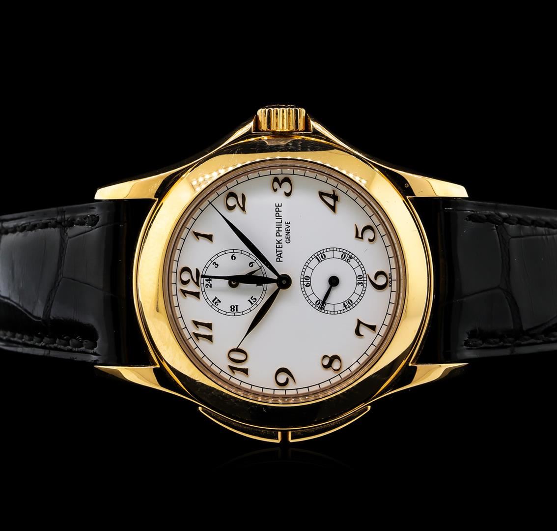 One, Patek Philippe Travel Time wristwatch electronically tested, 18KT Rose gold, Case: 38mm diameter, Swiss Hallmarked Case Back: synthetic sapphire exhibition, Water Resistant: 30 meters / 100 feet, Bezel: high polish finish, Crown: scalloped, with and a high relief logo, set within raised protective shoulders, Crystal: synthetic sapphire lens. Patek Philippe Geneva Switzerland Hallmarked Movement: eighteen jewel automatic, five adjustments including isochronism. Patek Philippe signed Dial: White color, pointed hands & raised numerals, separated by a bordering minute track, secondary time zone hand, a 24-hour "Home Time" indicator, and a small second's function. Patek Philippe Bracelet: saddle stitched leather strap, Condition: G-7 Near Mint. Eight inch length, adjustable. Patek Philippe 18KT Rose gold concealed deployment clasp, with logo. Total Weight of Watch 91.52gm. AIG Appraised at $22,000.00.