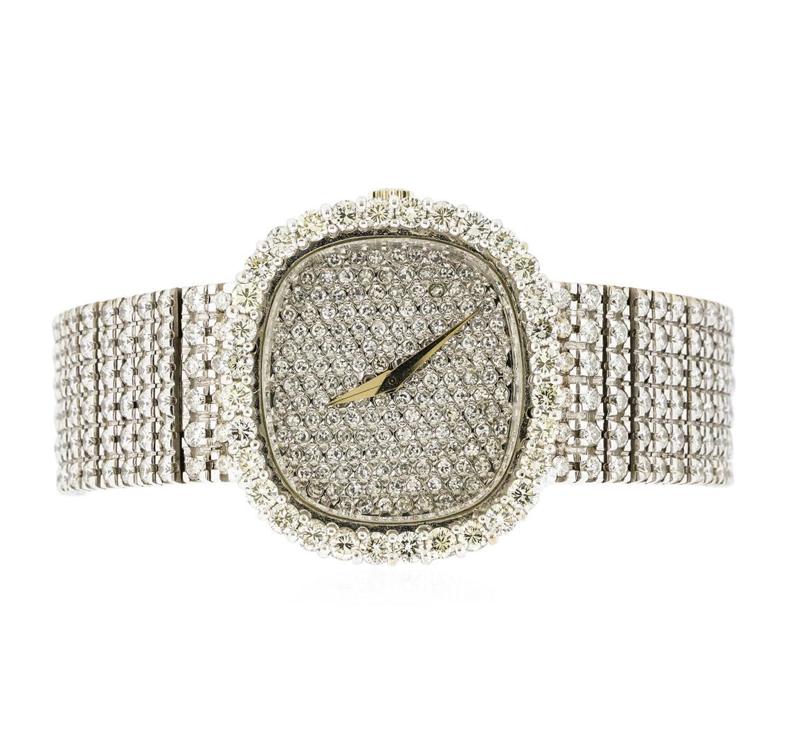 One gents, Patek Philippe wristwatch electronically tested 18KT White gold, Case: 25 x 25mm, Swiss Hallmarked Case Back: available space for engraving, Swiss Hallmarked Inner Case Back: engraved with the manufacturers name and ID numbers, Scalloped Crown: logo in high relief, Custom Bezel: diamond set, Crystal: synthetic sapphire lens. Condition: G-5 Fine. Movement: Patek Philippe mechanical, eighteen jewel with adjustments for heat & cold, Isochronism, and five position adjustments, Custom Dial: diamond set gallery, with pointed hands, Custom Bracelet: 18KT White gold, diamond set, Five and three quarter inch length. Three additional links are included with the watch, adding up to an inch in length. Containing: Approximately Five Hundred Eighty Eight prong set round brilliant & single cut diamonds, measuring from 1.10mm in diameter up to 2.50mm in diameter, approximate total weight of 588 Stones = 9.19ct. Graded in the setting. Clarity: VS-1 to SI-1 Average Color F - H. Total Weight of Diamonds 9.19ct. Total Weight of Watch 97.40gm. AIG Appraised at $35,000.00.