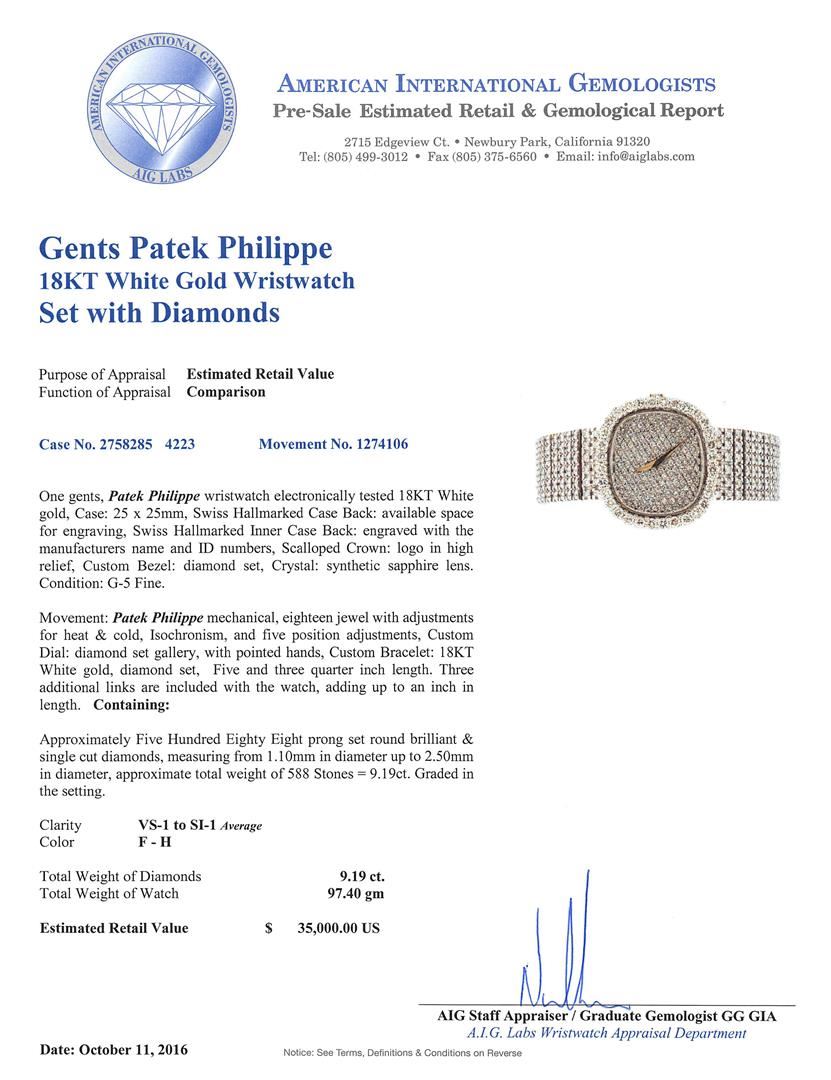 One gents, Patek Philippe wristwatch electronically tested 18KT White gold, Case: 25 x 25mm, Swiss Hallmarked Case Back: available space for engraving, Swiss Hallmarked Inner Case Back: engraved with the manufacturers name and ID numbers, Scalloped Crown: logo in high relief, Custom Bezel: diamond set, Crystal: synthetic sapphire lens. Condition: G-5 Fine. Movement: Patek Philippe mechanical, eighteen jewel with adjustments for heat & cold, Isochronism, and five position adjustments, Custom Dial: diamond set gallery, with pointed hands, Custom Bracelet: 18KT White gold, diamond set, Five and three quarter inch length. Three additional links are included with the watch, adding up to an inch in length. Containing: Approximately Five Hundred Eighty Eight prong set round brilliant & single cut diamonds, measuring from 1.10mm in diameter up to 2.50mm in diameter, approximate total weight of 588 Stones = 9.19ct. Graded in the setting. Clarity: VS-1 to SI-1 Average Color F - H. Total Weight of Diamonds 9.19ct. Total Weight of Watch 97.40gm. AIG Appraised at $35,000.00.