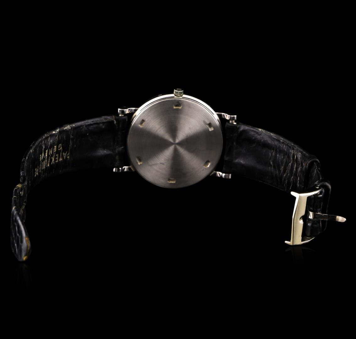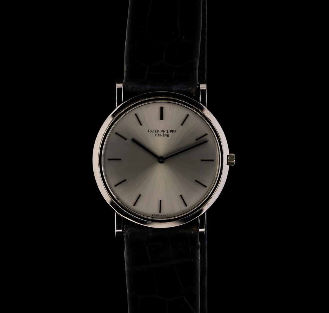 One gents, Patek Philippe wristwatch electronically tested 18KT White gold, Swiss Hallmarked Case: 32mm diameter, Water Resistant: 25 meters / 82 feet, Crown: scalloped with logo, Bezel: polished, Crystal: synthetic sapphire, Movement: mechanical, Patek Philippe signed Dial: Silver color, with baton narrow pointed hands, and indices, Bracelet: Patek Philippe saddle stitched leather strap, Condition: G-6 Extra Fine. Seven and one half inch length, adjustable. Patek Philippe 18KT White gold buckle. Total Weight of Watch 35.49gm. AIG Appraised at $10,200.00.