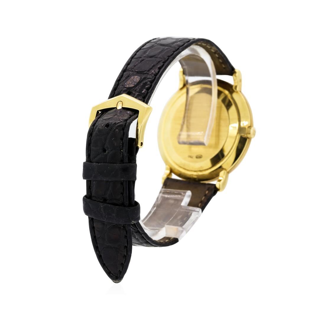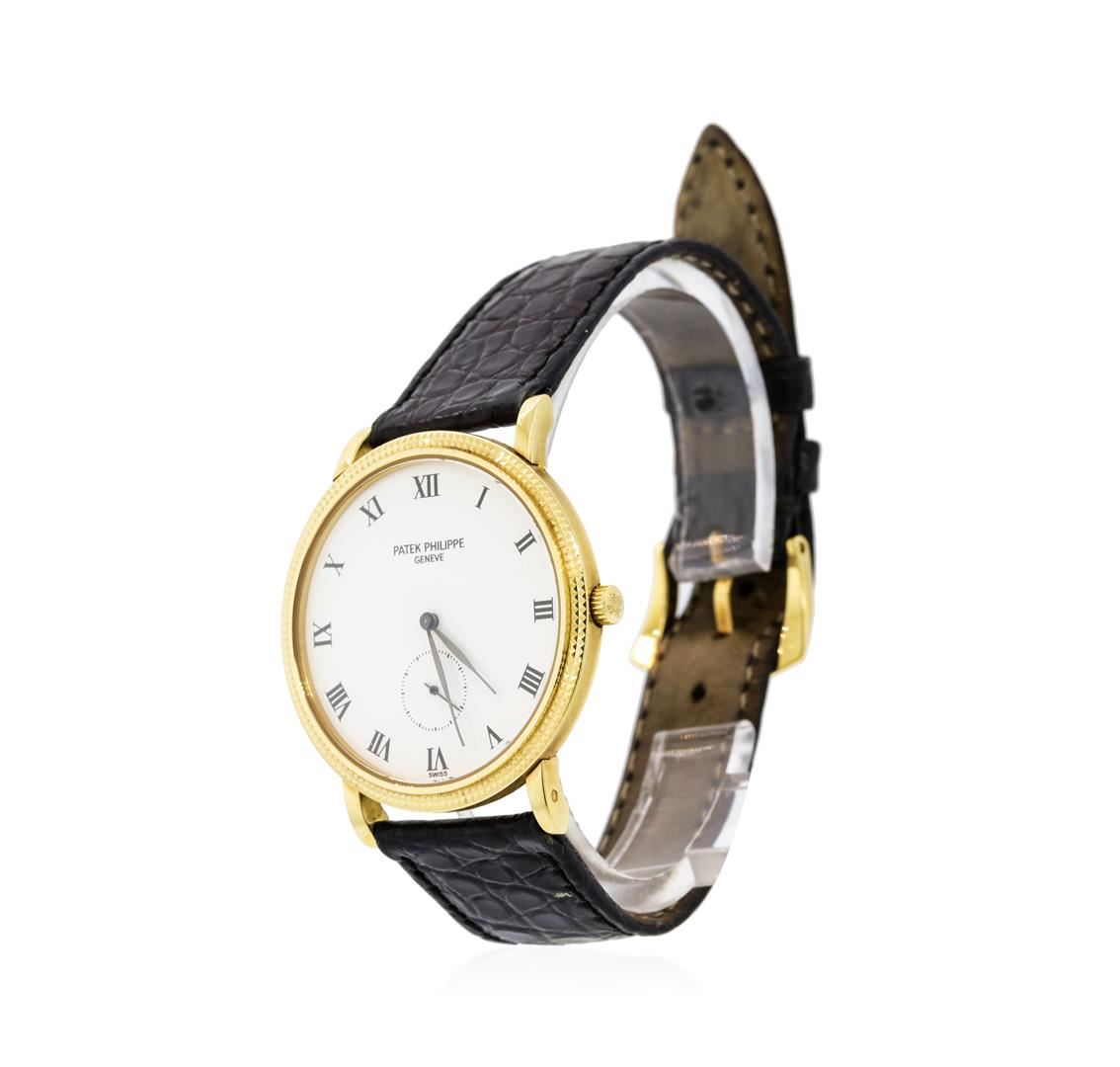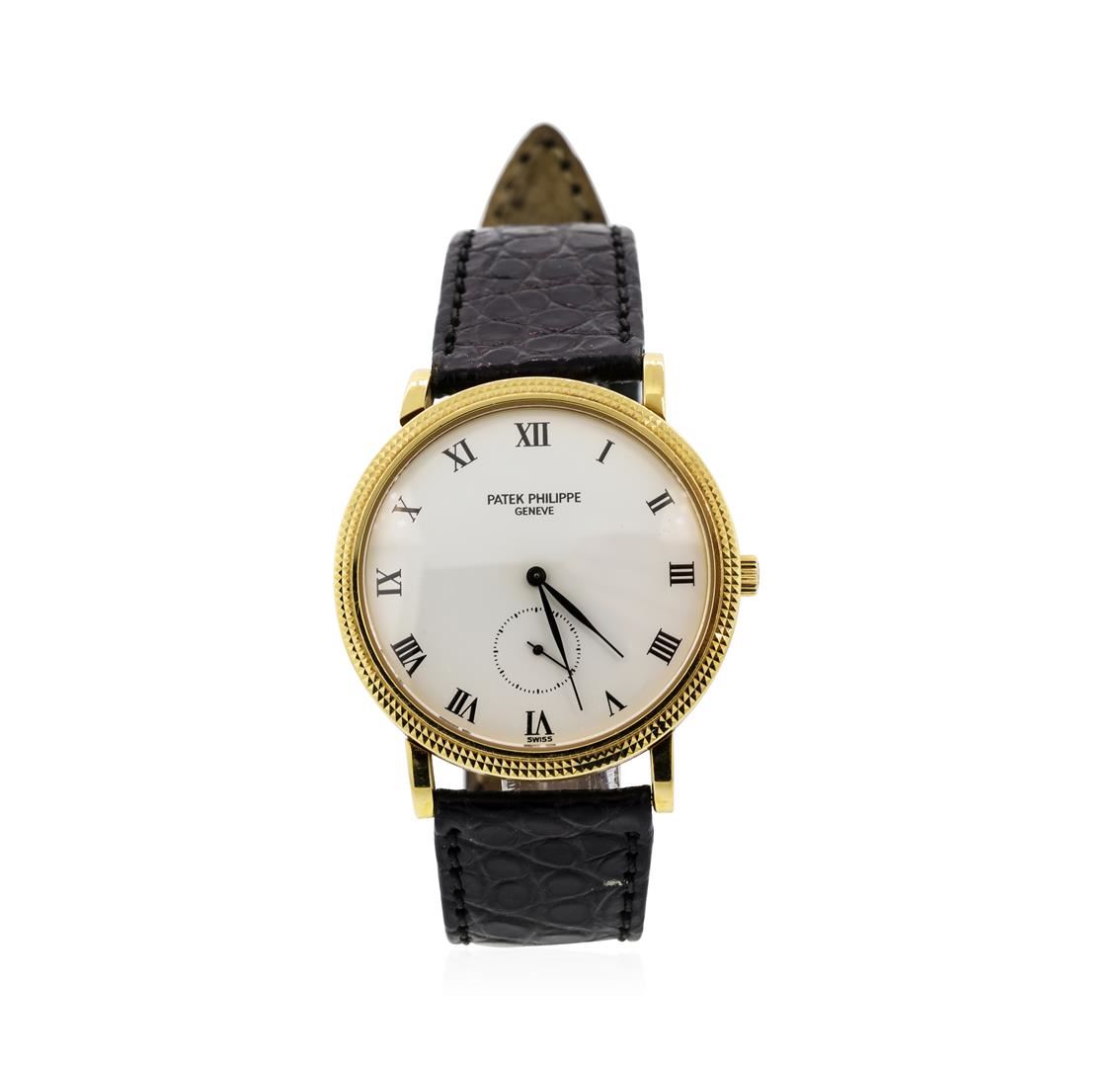 One Patek Philippe Calatrava manual wristwatch, case size 34mm. Patek ref. 3919 with an 18k yellow gold case and hobnail bezel, white Roman dial, sub-seconds dial, sapphire crystal, black Patek Philippe crocodile strap and 18k buckle. Movement number 1822821.