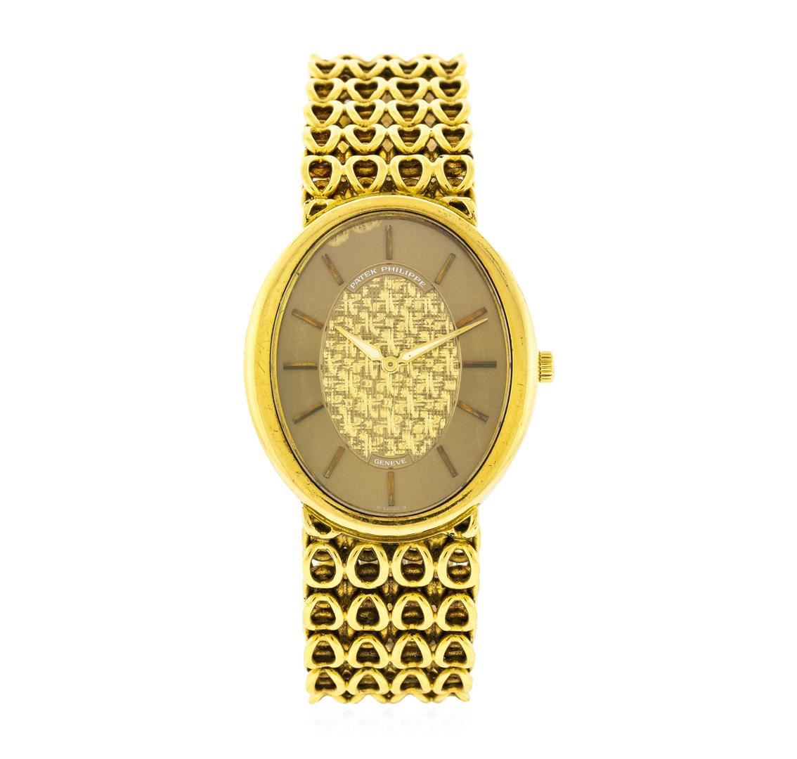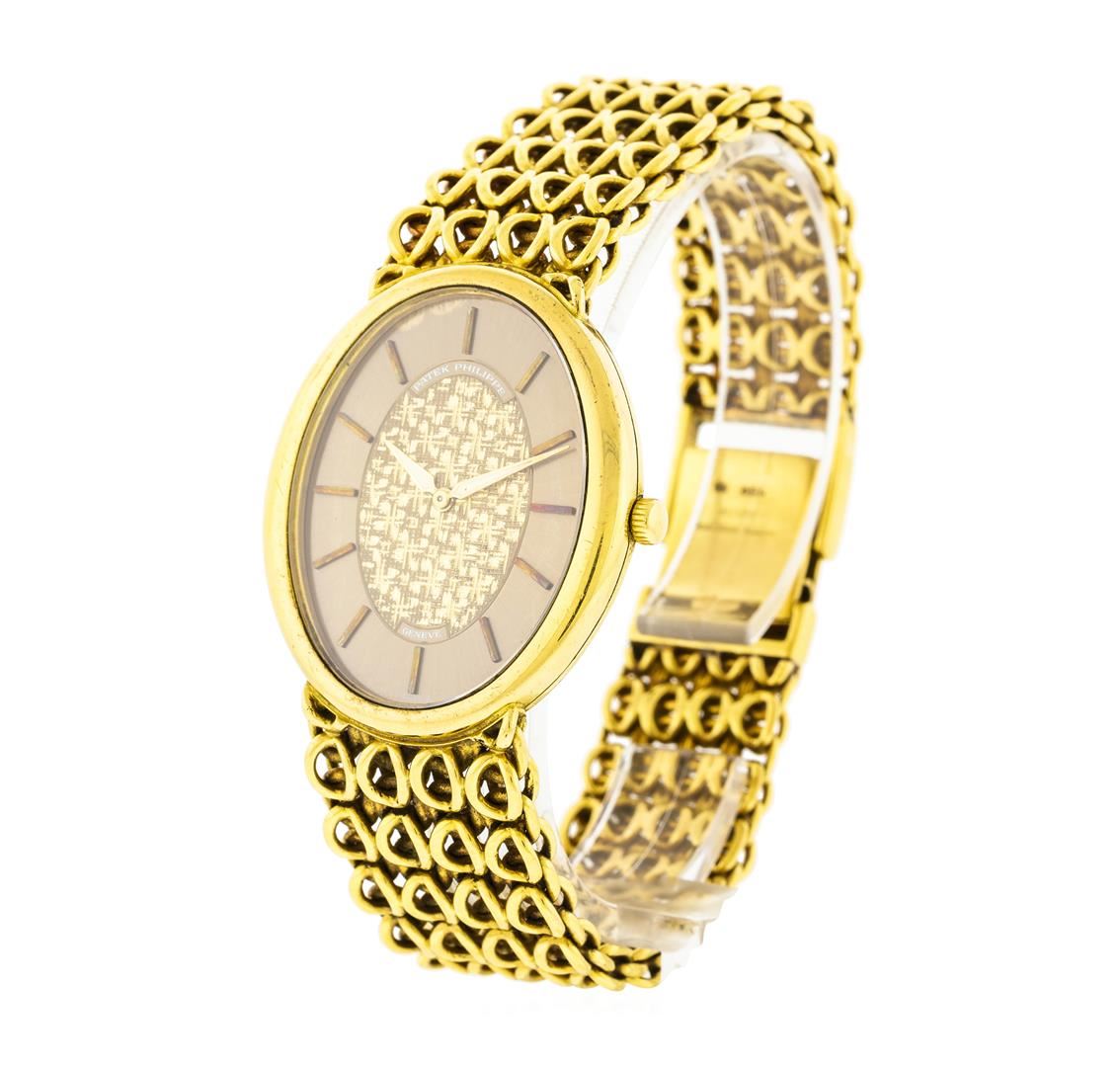 One, Patek Philippe Ellipse wristwatch electronically tested 18KT Yellow gold. Case: 35 x 30mm, Case Back: space available for engraving, Swiss Hallmarked Inner Case Back: engraved with the manufacturers name, ID numbers, and information, Crown: scalloped with logo, Bezel: high polish finish, Crystal: synthetic sapphire lens. Condition: G-5 Fine. Patek Philippe Movement: eighteen jewel Swiss mechanical, adjustments for Heat & Cold, Isochronism, and five positions, Patek Philippe signed Dial: chain pattern continuation framed by an oval shaped Bronze color section, baton pointed hands & raised indices, Patek Philippe Bracelet: 18KT Yellow gold woven chain link, Seven and one half inch length. Swiss & Patek Philippe Hallmarked clasp, with a high relief logo. Total Weight of Watch 89.09gm. AIG Appraised at $19,000.00.