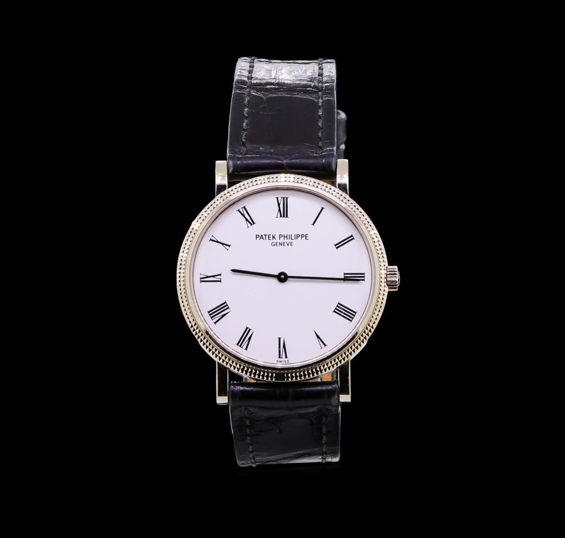 One Patek Philippe Calatrava watch featuring: Case: 18KT white gold, 35mm round. Dial: White with Roman numerals, pointed baton-type hands. Movement: Automatic. Bracelet: black leather. Crystal: Sapphire. Condition: very light wear on case and bracelet, overall near perfect condition.