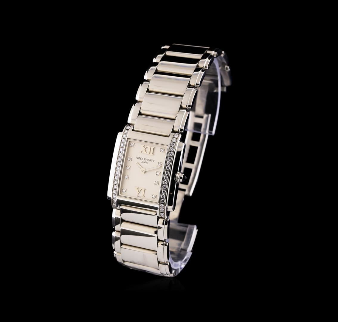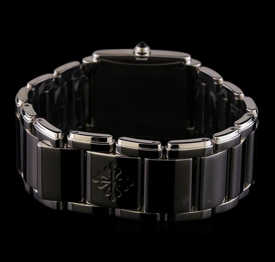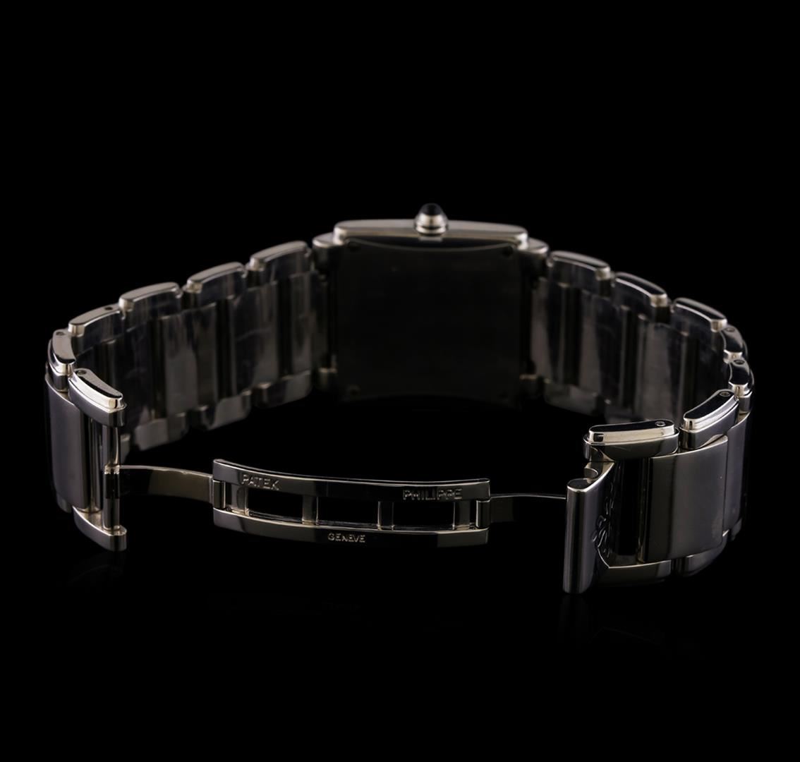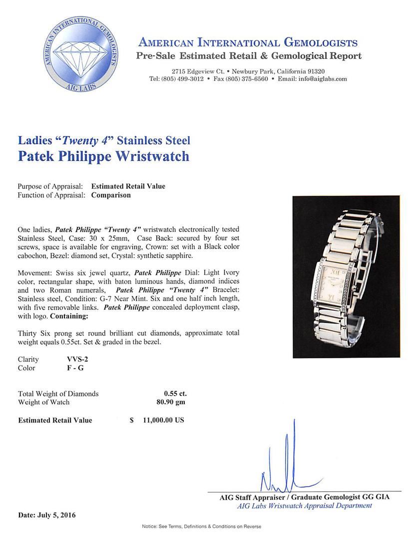 One ladies, Patek Philippe "Twenty 4" wristwatch electronically tested Stainless Steel, Case: 30 x 25mm, Case Back: secured by four set screws, space is available for engraving, Crown: set with a Black color cabochon, Bezel: diamond set, Crystal: synthetic sapphire. Movement: Swiss six jewel quartz, Patek Philippe Dial: Light Ivory color, rectangular shape, with baton luminous hands, diamond indices and two Roman numerals, Patek Philippe "Twenty 4" Bracelet: Stainless steel, Condition: G-7 Near Mint. Six and one half inch length, with five removable links. Patek Philippe concealed deployment clasp, with logo. Containing: Thirty Six prong set round brilliant cut diamonds, approximate total weight equals 0.55ct. Set & graded in the bezel. Clarity: VVS-2. Color: F - G. Total Weight of Diamonds 0.55ct. Weight of Watch 80.90gm. AIG Appraised at $11,000.00.