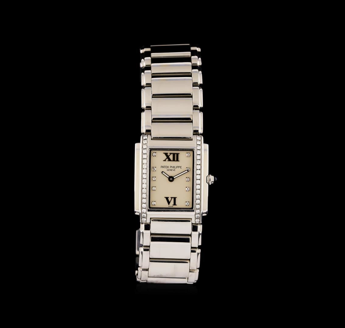 One ladies, Patek Philippe "Twenty 4" wristwatch electronically tested Stainless Steel, Case: 30 x 25mm, Case Back: secured by four set screws, space is available for engraving, Crown: set with a Black color cabochon, Bezel: diamond set, Crystal: synthetic sapphire. Movement: Swiss six jewel quartz, Patek Philippe Dial: Light Ivory color, rectangular shape, with baton luminous hands, diamond indices and two Roman numerals, Patek Philippe "Twenty 4" Bracelet: Stainless steel, Condition: G-7 Near Mint. Six and one half inch length, with five removable links. Patek Philippe concealed deployment clasp, with logo. Containing: Thirty Six prong set round brilliant cut diamonds, approximate total weight equals 0.55ct. Set & graded in the bezel. Clarity: VVS-2. Color: F - G. Total Weight of Diamonds 0.55ct. Weight of Watch 80.90gm. AIG Appraised at $11,000.00.