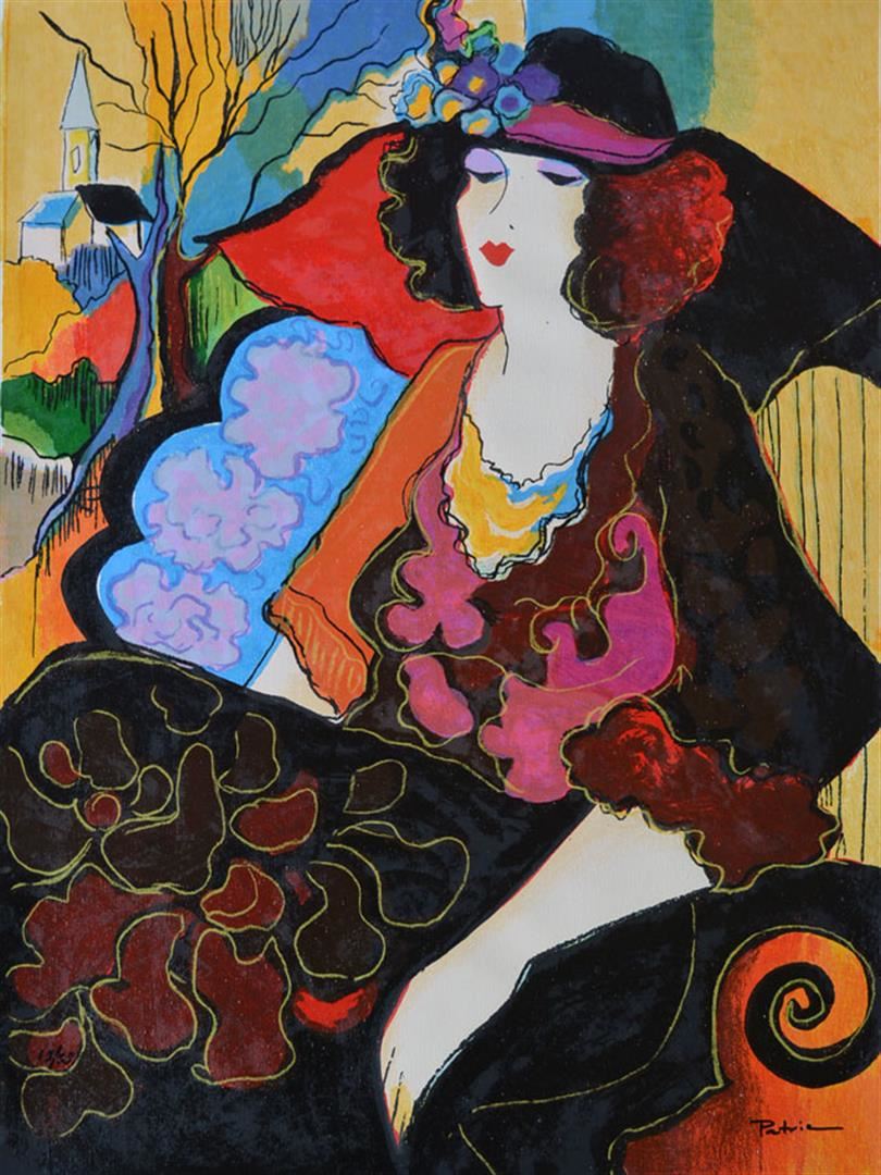 Artist: Patricia Govezensky - Title: Elizabeth - Medium: Serigraph on Canvas - Signature: Hand-signed by the Artist - Limited Edition: 99 - Image Size: Approximately 19.5 inches x 14.75 inches - Stretched and Ready for Framing - Details: This work comes with a Certificate of Authenticity - Patricia, a sensitive artist, brings to her canvas the immortal effeminate woman, combining her tender touch and simplicity with magic moments of beauty in delicate domain. She invites us to share the public intimacy of an informal French Cafe and the euphoric mystery of a woman?s room.