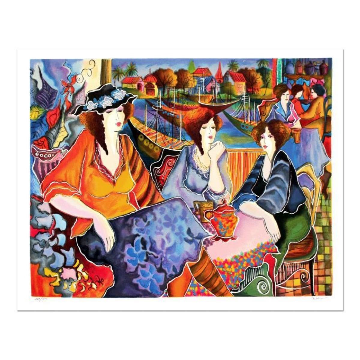 "Port Cafe Friends" is a limited edition Serigraph on Paper by Patricia Govezensky. The piece is numbered, hand signed by the artist, and come with a letter of authenticity. Measures approximately 19" x 23".