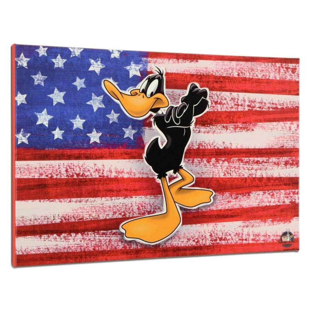 "Patriotic Series: Daffy Duck" is a limited edition giclee on gallery wrapped canvas by Looney Tunes. This piece comes from an edition of 250 and bears an imprint of Looney Tunes' official seal. Includes Certificate of Authenticity. Measures approx. 30" x 20" (image) This item requires special handling and may have a longer than usual turnaround.