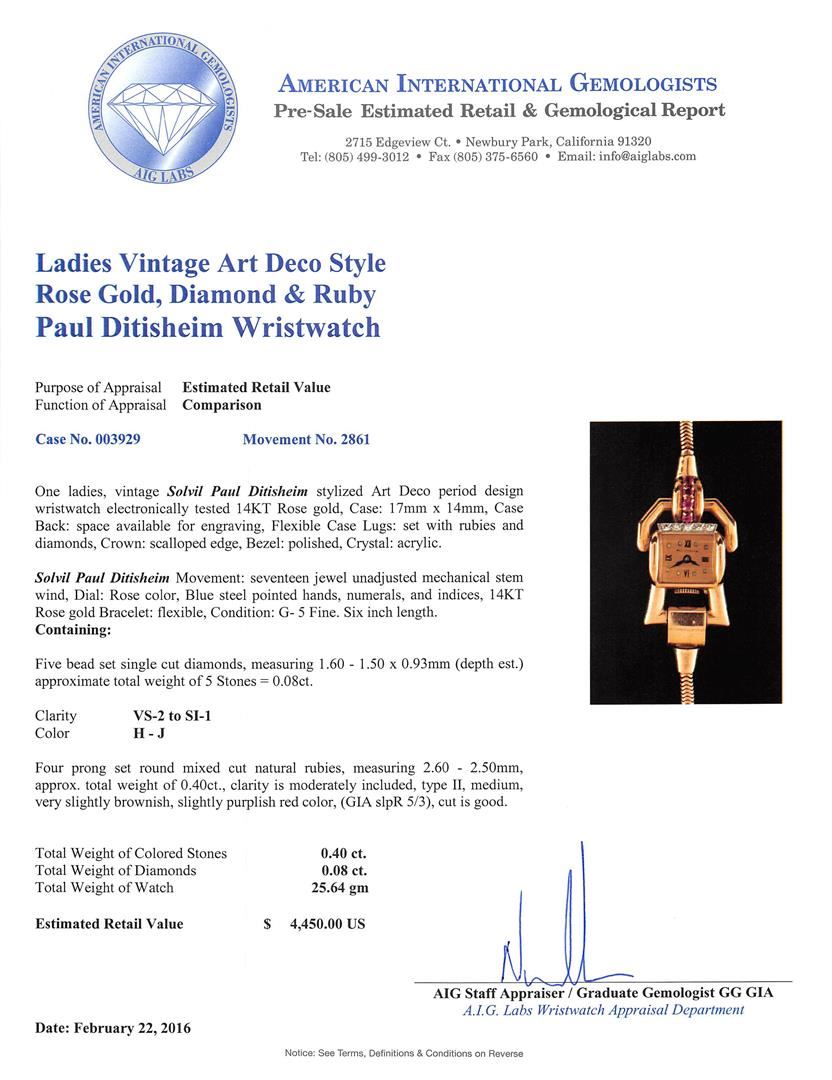 One ladies, vintage Solvil Paul Ditisheim stylized Art Deco period design wristwatch electronically tested 14KT Rose gold, Case: 17mm x 14mm, Case Back: space available for engraving, Flexible Case Lugs: set with rubies and diamonds, Crown: scalloped edge, Bezel: polished, Crystal: acrylic. Solvil Paul Ditisheim Movement: seventeen jewel unadjusted mechanical stem wind, Dial: Rose color, Blue steel pointed hands, numerals, and indices, 14KT Rose gold Bracelet: flexible, Condition: G- 5 Fine. Six inch length. Containing: Five bead set single cut diamonds, measuring 1.60 - 1.50 x 0.93mm (depth est.) approximate total weight of 5 Stones = 0.08ct. Clarity: VS-2 to SI-1. Color: H - J Four prong set round mixed cut natural rubies, measuring 2.60 - 2.50 x 1.66 mm, approximate total weight of 0.40ct., clarity is moderately included, type II, medium, very slightly brownish, slightly purplish red color, (GIA slpR 5/3), cut is good. Total Weight of Colored Stones 0.40ct. Total Weight of Diamonds 0.08ct. Total Weight of Watch 25.64gm. AIG Appraised at $4,450.00.