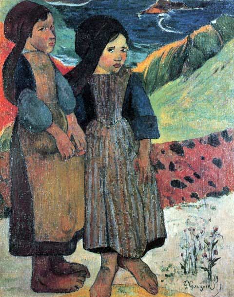 Artist: Paul Gauguin - Title: Breton Near Sea - Medium: Fine Art Reproduction Giclee on Canvas - Image Size: Approximately 20 inches x 15.75 inches - Unframed on Unstretched Canvas - Biography: French post-impressionist artist Paul Gauguin was an important figure in the Symbolist art movement of the early 1900's. His use of bold colors, exaggerated body proportions and stark contrasts in his paintings set him apart from his contemporaries, helping pave the way for the Primitivism art movement. Gauguin often sought exotic environments and spent time living and painting in Tahiti.