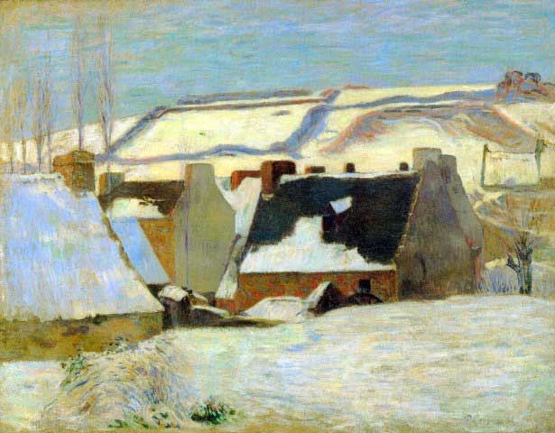 Artist: Paul Gauguin - Title: Breton Village in Snow - Medium: Fine Art Reproduction Giclee on Canvas - Image Size: Approximately 15.5 inches x 20 inches - Unframed on Unstretched Canvas - Biography: French post-impressionist artist Paul Gauguin was an important figure in the Symbolist art movement of the early 1900's. His use of bold colors, exaggerated body proportions and stark contrasts in his paintings set him apart from his contemporaries, helping pave the way for the Primitivism art movement. Gauguin often sought exotic environments and spent time living and painting in Tahiti.