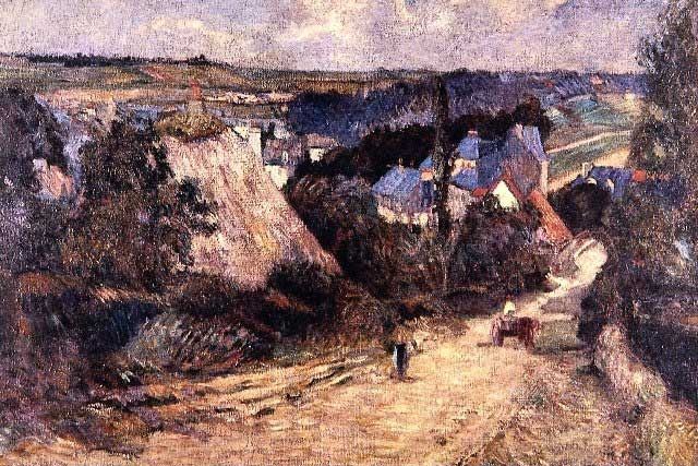 Artist: Paul Gauguin - Title: Entrance to a Village - Medium: Fine Art Reproduction Giclee on Canvas - Image Size: Approximately 13.25 inches x 20 inches - Unframed on Unstretched Canvas - Biography: French post-impressionist artist Paul Gauguin was an important figure in the Symbolist art movement of the early 1900's. His use of bold colors, exaggerated body proportions and stark contrasts in his paintings set him apart from his contemporaries, helping pave the way for the Primitivism art movement. Gauguin often sought exotic environments and spent time living and painting in Tahiti.