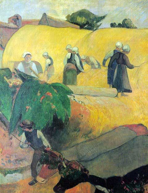 Artist: Paul Gauguin - Title: Harvest In Brittany - Medium: Fine Art Reproduction Giclee on Canvas - Image Size: Approximately 20 inches x 15.25 inches - Unframed on Unstretched Canvas - Biography: French post-impressionist artist Paul Gauguin was an important figure in the Symbolist art movement of the early 1900's. His use of bold colors, exaggerated body proportions and stark contrasts in his paintings set him apart from his contemporaries, helping pave the way for the Primitivism art movement. Gauguin often sought exotic environments and spent time living and painting in Tahiti.