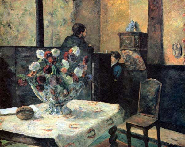 Artist: Paul Gauguin - Title: Interior of Painter of Rue Carcel - Medium: Fine Art Reproduction Giclee on Canvas - Image Size: Approximately 16 inches x 20 inches - Unframed on Unstretched Canvas - Biography: French post-impressionist artist Paul Gauguin was an important figure in the Symbolist art movement of the early 1900's. His use of bold colors, exaggerated body proportions and stark contrasts in his paintings set him apart from his contemporaries, helping pave the way for the Primitivism art movement. Gauguin often sought exotic environments and spent time living and painting in Tahiti.