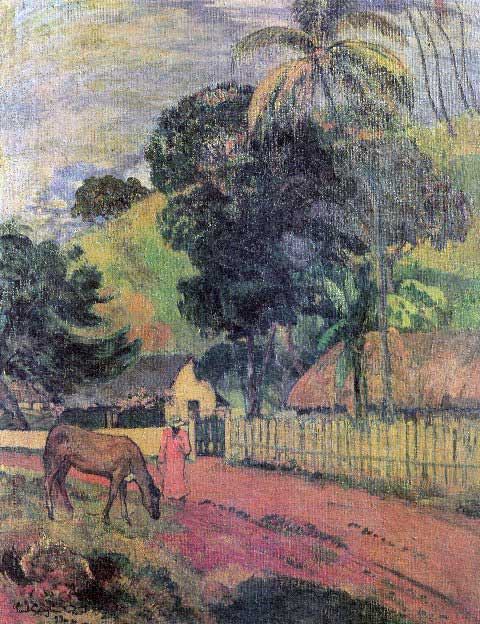Artist: Paul Gauguin - Title: Landscape - Medium: Fine Art Reproduction Giclee on Canvas - Image Size: Approximately 20 inches x 15.25 inches - Unframed on Unstretched Canvas - Biography: French post-impressionist artist Paul Gauguin was an important figure in the Symbolist art movement of the early 1900's. His use of bold colors, exaggerated body proportions and stark contrasts in his paintings set him apart from his contemporaries, helping pave the way for the Primitivism art movement. Gauguin often sought exotic environments and spent time living and painting in Tahiti.