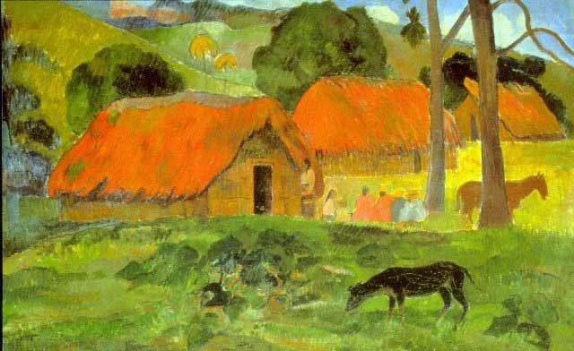 Artist: Paul Gauguin - Title: Le Trois Huttes - Medium: Fine Art Reproduction Giclee on Canvas - Image Size: Approximately 12.25 inches x 20 inches - Unframed on Unstretched Canvas - Biography: French post-impressionist artist Paul Gauguin was an important figure in the Symbolist art movement of the early 1900's. His use of bold colors, exaggerated body proportions and stark contrasts in his paintings set him apart from his contemporaries, helping pave the way for the Primitivism art movement. Gauguin often sought exotic environments and spent time living and painting in Tahiti.