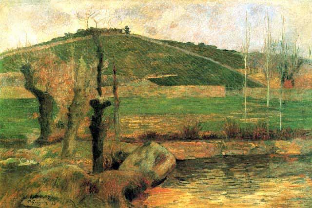 Artist: Paul Gauguin - Title: Look at Sainte Margueritte near Pont-Avon - Medium: Fine Art Reproduction Giclee on Canvas - Image Size: Approximately 13.25 inches x 20 inches - Unframed on Unstretched Canvas - Biography: French post-impressionist artist Paul Gauguin was an important figure in the Symbolist art movement of the early 1900's. His use of bold colors, exaggerated body proportions and stark contrasts in his paintings set him apart from his contemporaries, helping pave the way for the Primitivism art movement. Gauguin often sought exotic environments and spent time living and painting in Tahiti.