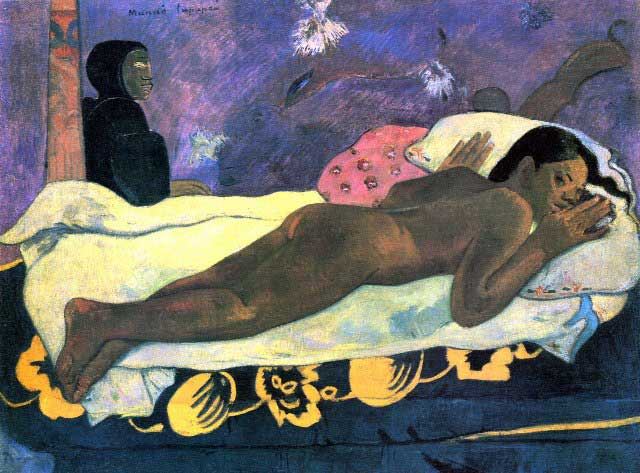 Artist: Paul Gauguin - Title: Manao Tupapau - Medium: Fine Art Reproduction Giclee on Canvas - Image Size: Approximately 14.75 inches x 20 inches - Unframed on Unstretched Canvas - Biography: French post-impressionist artist Paul Gauguin was an important figure in the Symbolist art movement of the early 1900's. His use of bold colors, exaggerated body proportions and stark contrasts in his paintings set him apart from his contemporaries, helping pave the way for the Primitivism art movement. Gauguin often sought exotic environments and spent time living and painting in Tahiti.