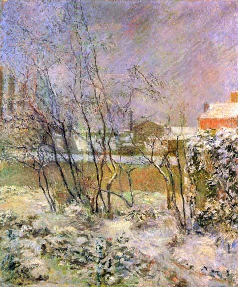 Artist: Paul Gauguin - Title: Snow in Rue Carcel - Medium: Fine Art Reproduction Giclee on Canvas - Image Size: Approximately 20 inches x 16.5 inches - Unframed on Unstretched Canvas - Biography: French post-impressionist artist Paul Gauguin was an important figure in the Symbolist art movement of the early 1900's. His use of bold colors, exaggerated body proportions and stark contrasts in his paintings set him apart from his contemporaries, helping pave the way for the Primitivism art movement. Gauguin often sought exotic environments and spent time living and painting in Tahiti.