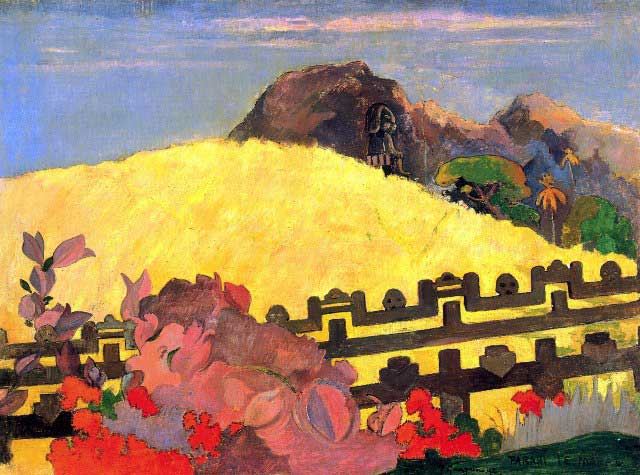 Artist: Paul Gauguin - Title: There is the Temple - Medium: Fine Art Reproduction Giclee on Canvas - Image Size: Approximately 14.75 inches x 20 inches - Unframed on Unstretched Canvas - Biography: French post-impressionist artist Paul Gauguin was an important figure in the Symbolist art movement of the early 1900's. His use of bold colors, exaggerated body proportions and stark contrasts in his paintings set him apart from his contemporaries, helping pave the way for the Primitivism art movement. Gauguin often sought exotic environments and spent time living and painting in Tahiti.
