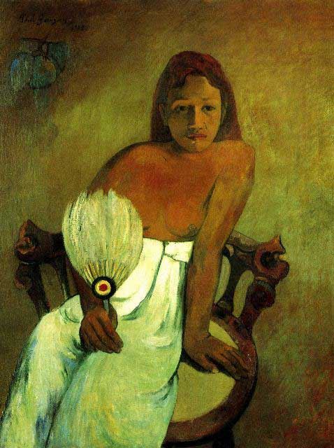 Artist: Paul Gauguin - Title: Young Girl with Fan - Medium: Fine Art Reproduction Giclee on Canvas - Image Size: Approximately 20 inches x 15 inches - Unframed on Unstretched Canvas - Biography: French post-impressionist artist Paul Gauguin was an important figure in the Symbolist art movement of the early 1900's. His use of bold colors, exaggerated body proportions and stark contrasts in his paintings set him apart from his contemporaries, helping pave the way for the Primitivism art movement. Gauguin often sought exotic environments and spent time living and painting in Tahiti.