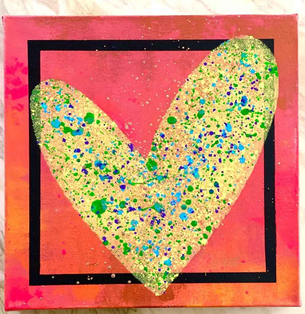 Paulina Del Mar "Hot Pink with Yellow Heart" Original One of Kind Mixed Media Acrylic on Stretched Canvas, Hand Signed Dimensions: 12 x 12 inches
